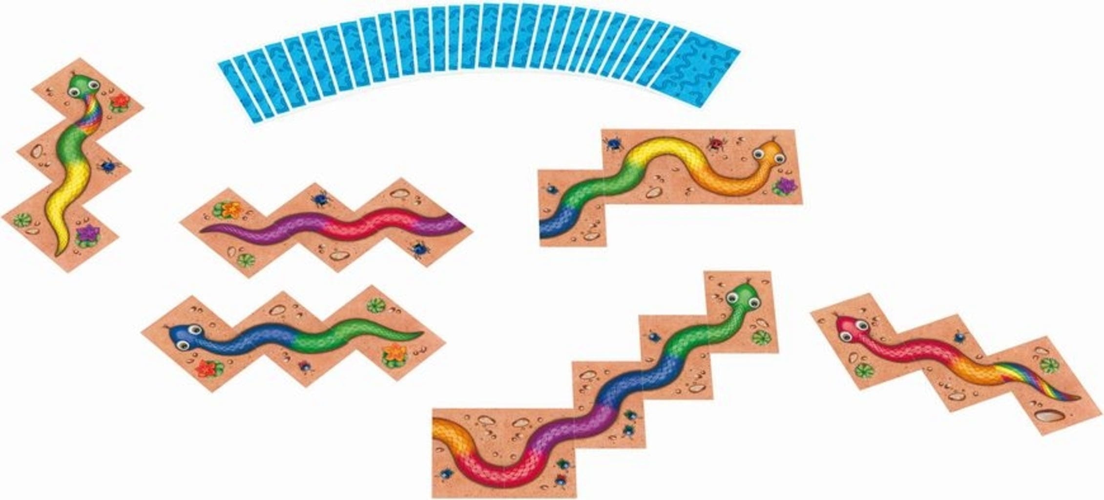 ¿Quién puede crear la serpiente arco iris más larga? Roba una carta del mazo, colócala adecuadamente y complétala con la pieza correcta. El juego continúa hasta que se agota toda la baraja. Gana quien tenga más cartas de serpiente delante