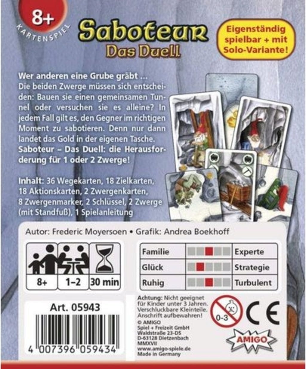¿Qué ocurre cuando dos enanos codiciosos se pelean por la misma pepita de oro? Descúbrelo en Saboteur - El Duelo. Puedes aliarte con tu oponente al principio y sabotearlo en el momento crucial. Es la única manera de proteger las preciadas cartas de oro. O puedes intentar conseguir la mayor cantidad de oro posible en tres rondas en modo individual.