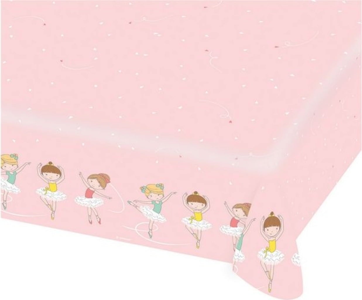 Mantel de papel rosa para una fiesta de cumpleaños infantil, decorado con pequeños corazones rojos y blancos. En el lateral, unas simpáticas bailarinas hacen piruetas.