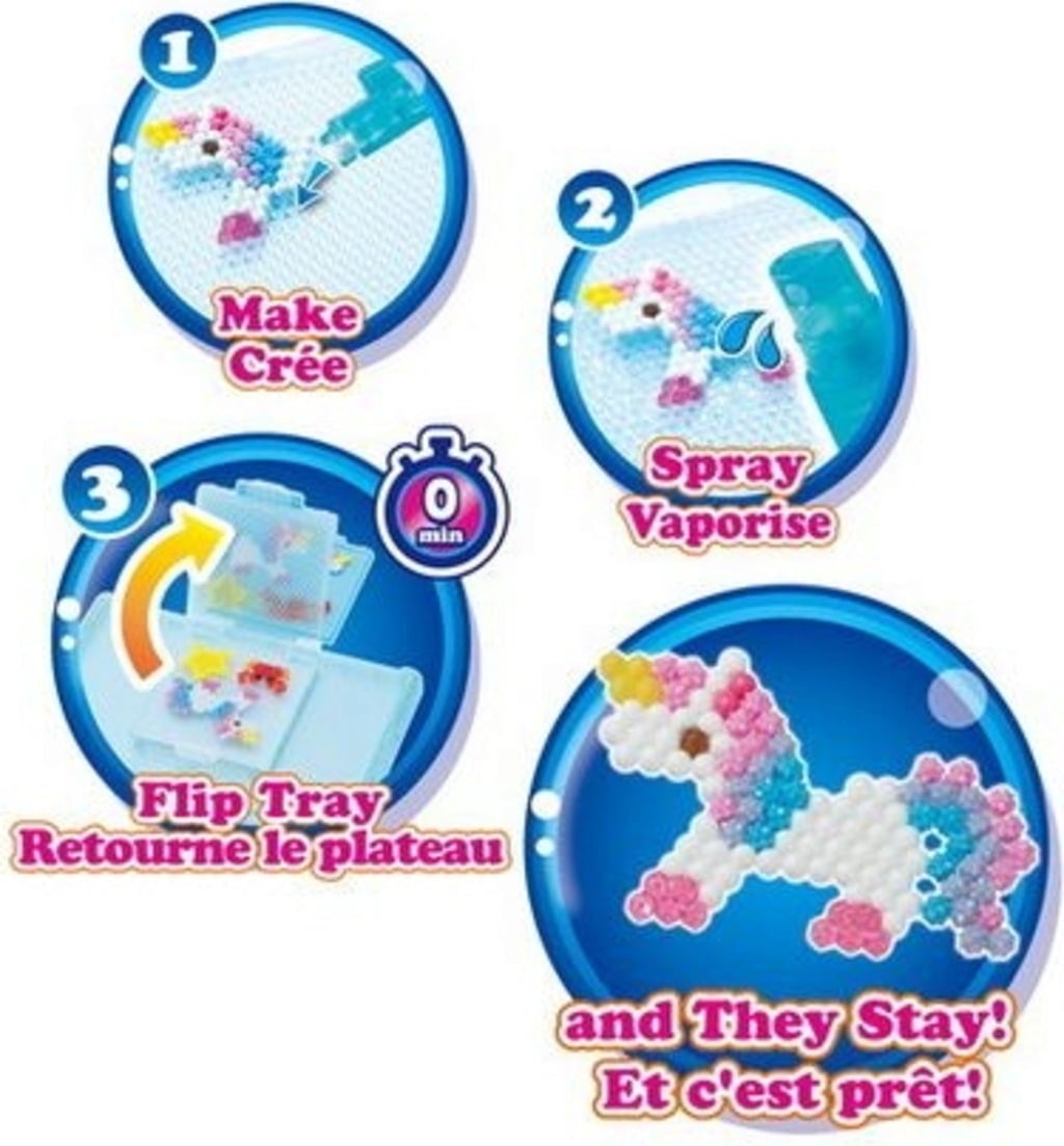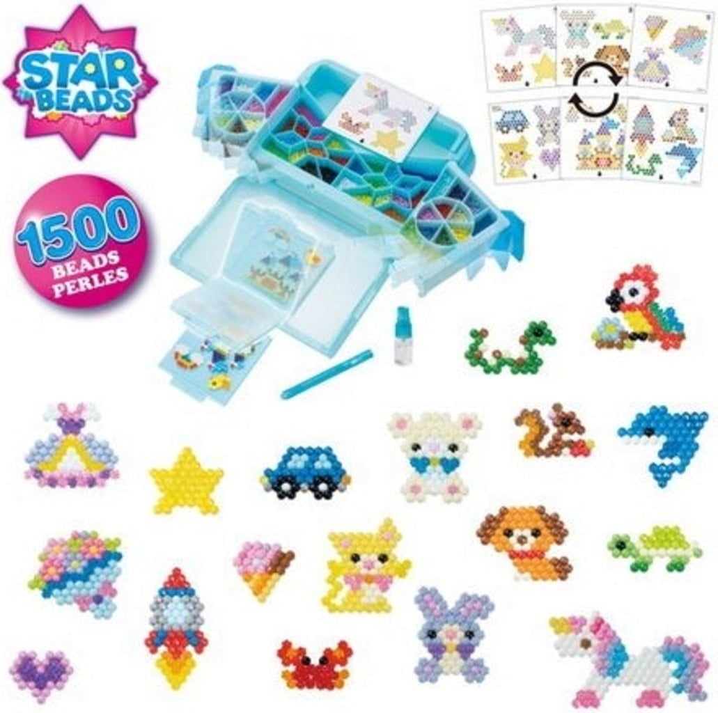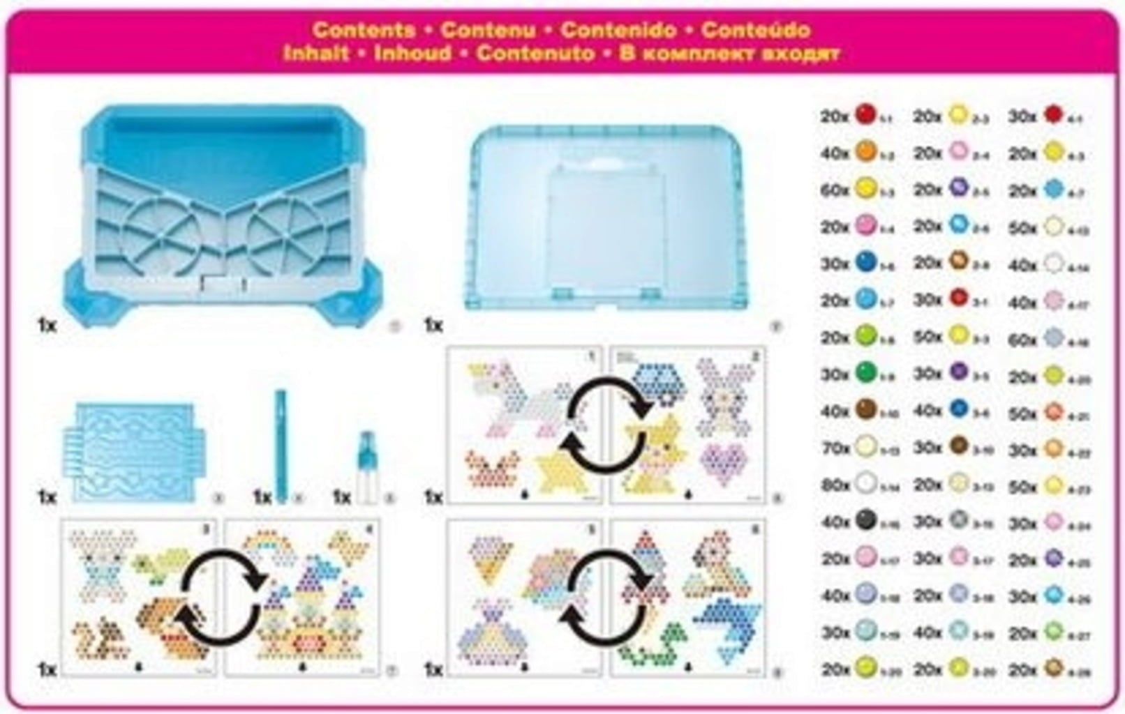 Contenido: 1500 cuentas de colores para manualidades, caja de cuentas con tapa abatible, botella pulverizadora, rotulador de cuentas 2 en 1, plantillas de motivos