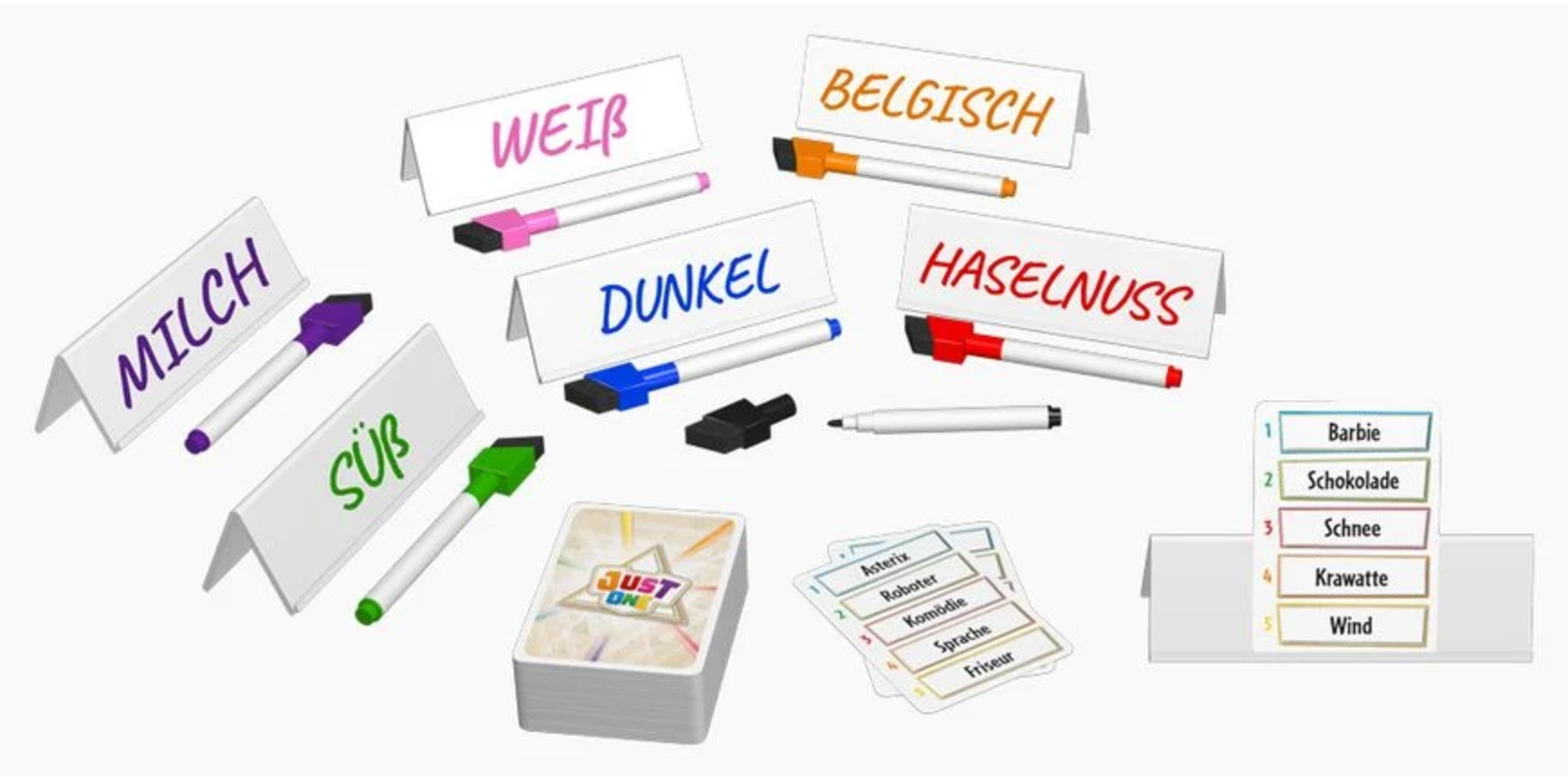 Just 1 - ¡sólo un término es correcto! Descubre uno de los juegos para fiestas más divertidos. Adivina por turnos una de las 13 palabras, pero en lugar de largas explicaciones, cada jugador sólo puede escribir una palabra en el tablero incluido. Los términos escritos dos veces se eliminan y las palabras restantes se presentan al jugador que las adivina. Si el jugador adivina el término, suma un punto para el equipo.