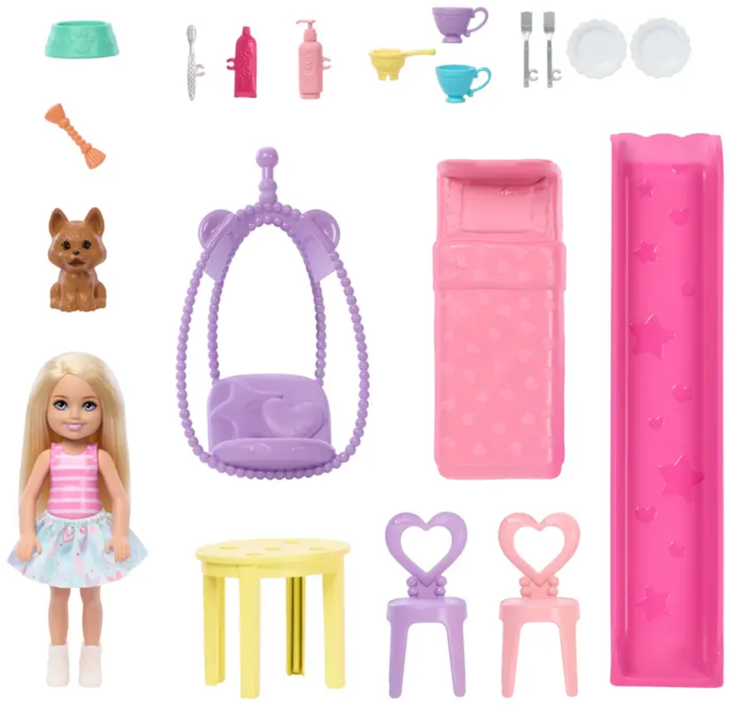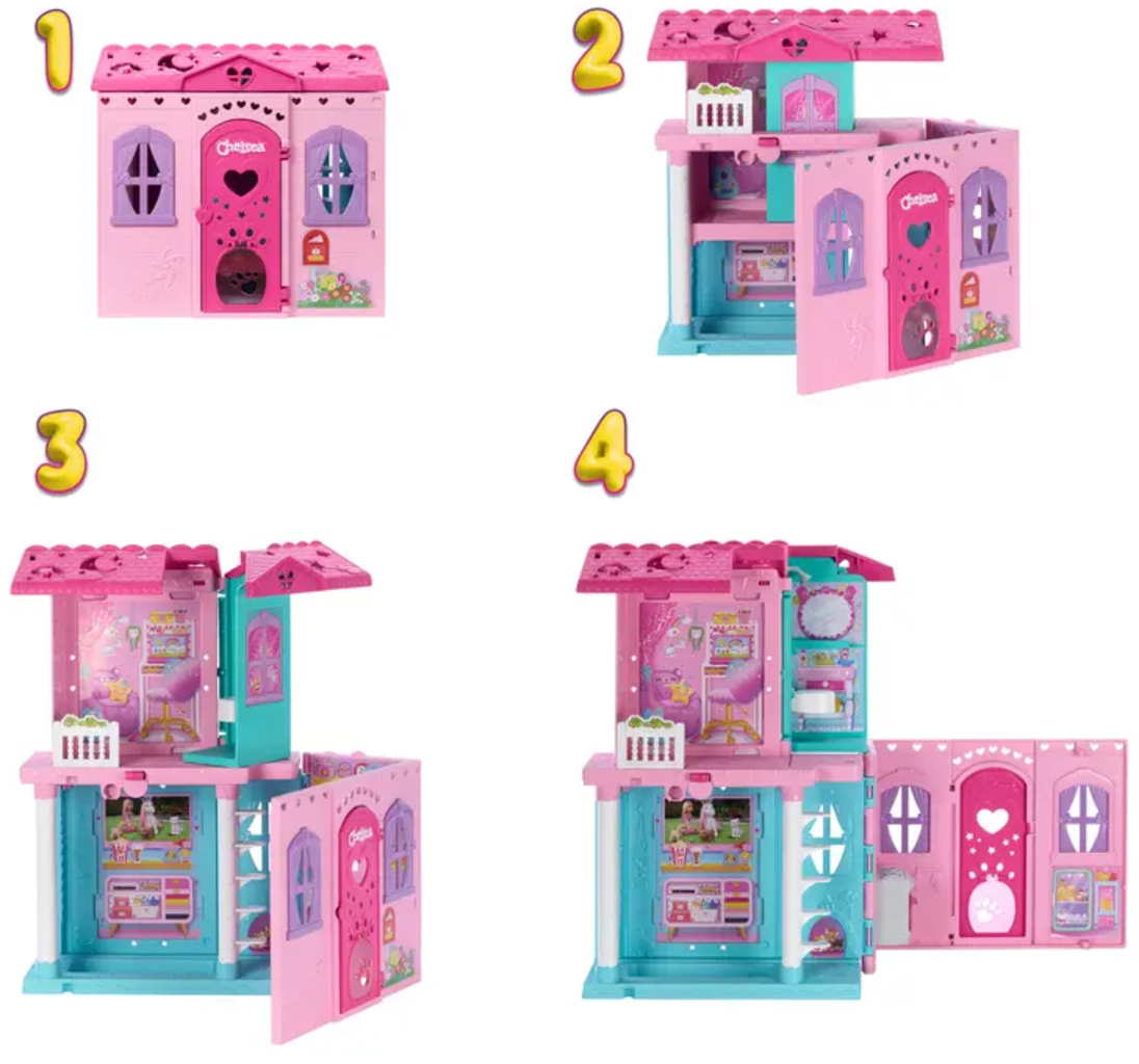 Con la casa de muñecas desplegable Chelsea, ¡jugar se convierte en una gran aventura! La casita se transforma en una enorme casa de muñecas con más de cinco zonas de juego. Ya sea cocinando en la cocina, descansando en el salón, durmiendo en el dormitorio o retozando en el baño, Chelsea y su perro se divertirán a lo grande.