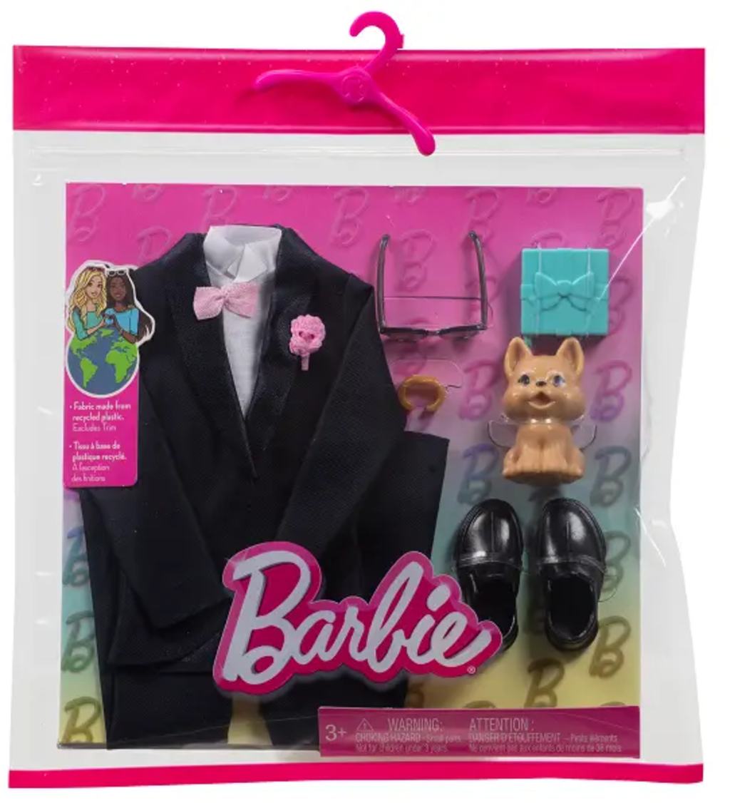 ¡El gran día será perfecto con el conjunto de moda Barbie para Ken! El conjunto incluye un elegante traje de dos piezas con solapas de raso, pajarita rosa y broche, así como unos clásicos zapatos negros. Incluye accesorios como una bolsita para el anillo, un reloj dorado, gafas de sol y un simpático perrito. Ideal para recrear creativamente historias de boda con Barbie y Ken. Muñecos no incluidos.