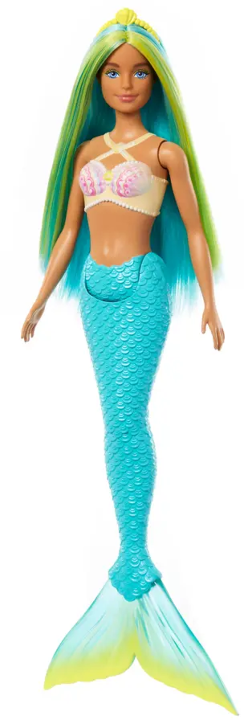 ¡Sumérgete en el mundo de la fantasía con esta muñeca sirena Barbie! Con su aleta caudal de color turquesa, sus mechas azules y amarillas y su cinta para el pelo, todas las niñas vivirán mágicas aventuras submarinas.