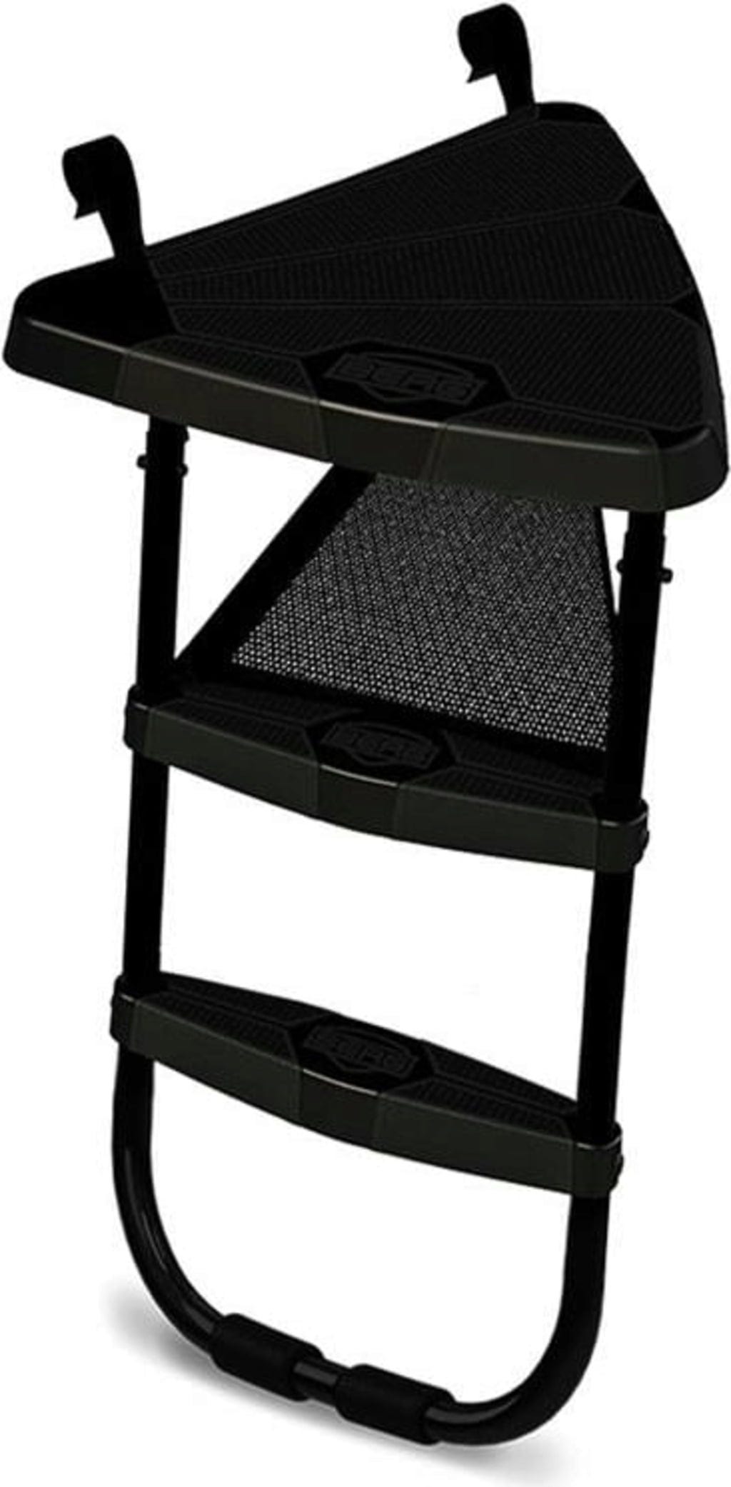 Esta versátil escalera con plataforma tiene peldaños que dejan escurrir el agua y un revestimiento antideslizante. Fácil de montar y acoplar a la cama elástica, la escalera cuenta con una red que puede utilizarse para guardar el calzado.