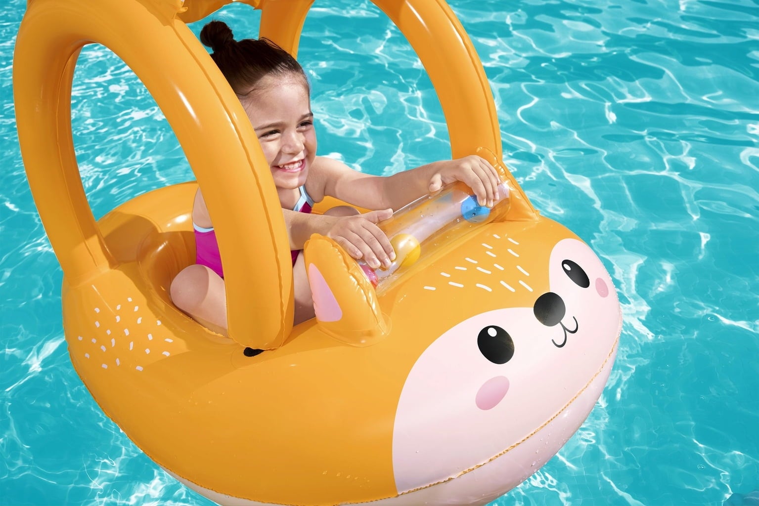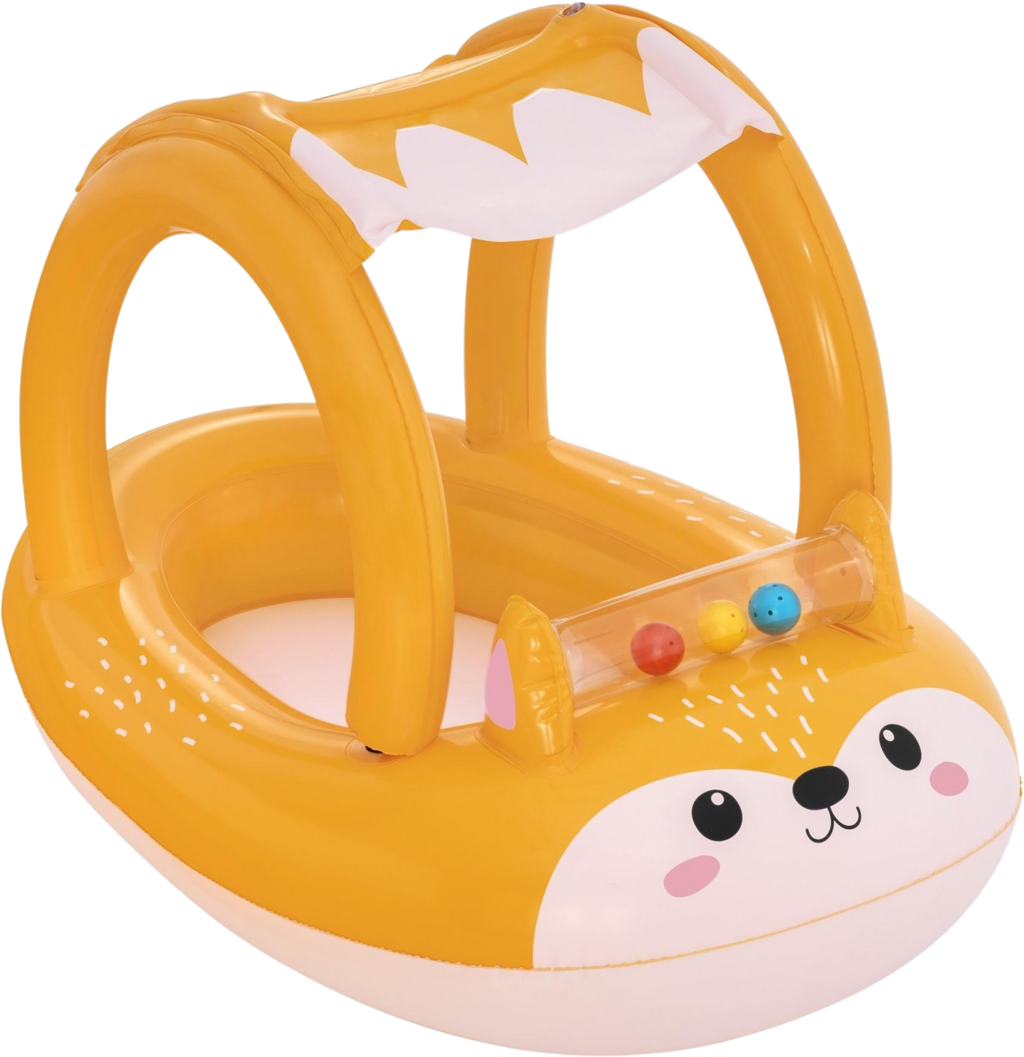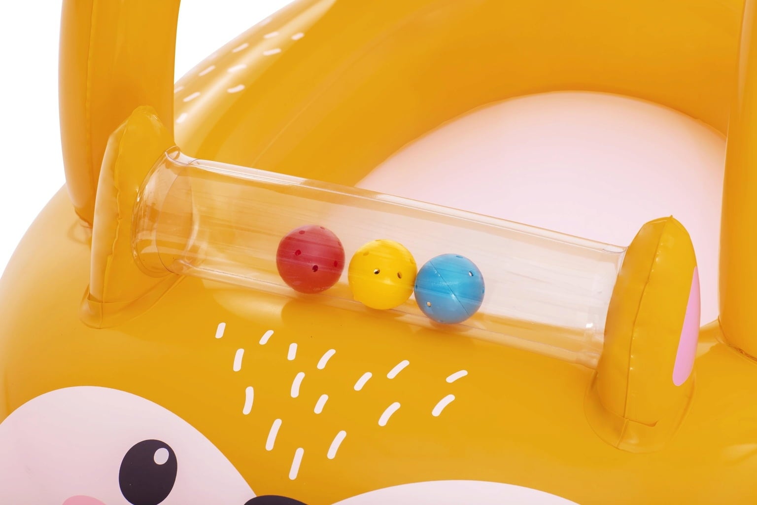 ¿Listo para una diversión acuática muy especial? Sube a bordo de este fantástico bote hinchable con forma de zorro de Bestway, diseñado para niños a partir de 3 años. En la parte delantera del bote, un tubo cilíndrico contiene tres bolas de colores que se mueven de un lado a otro haciendo divertidos ruidos.