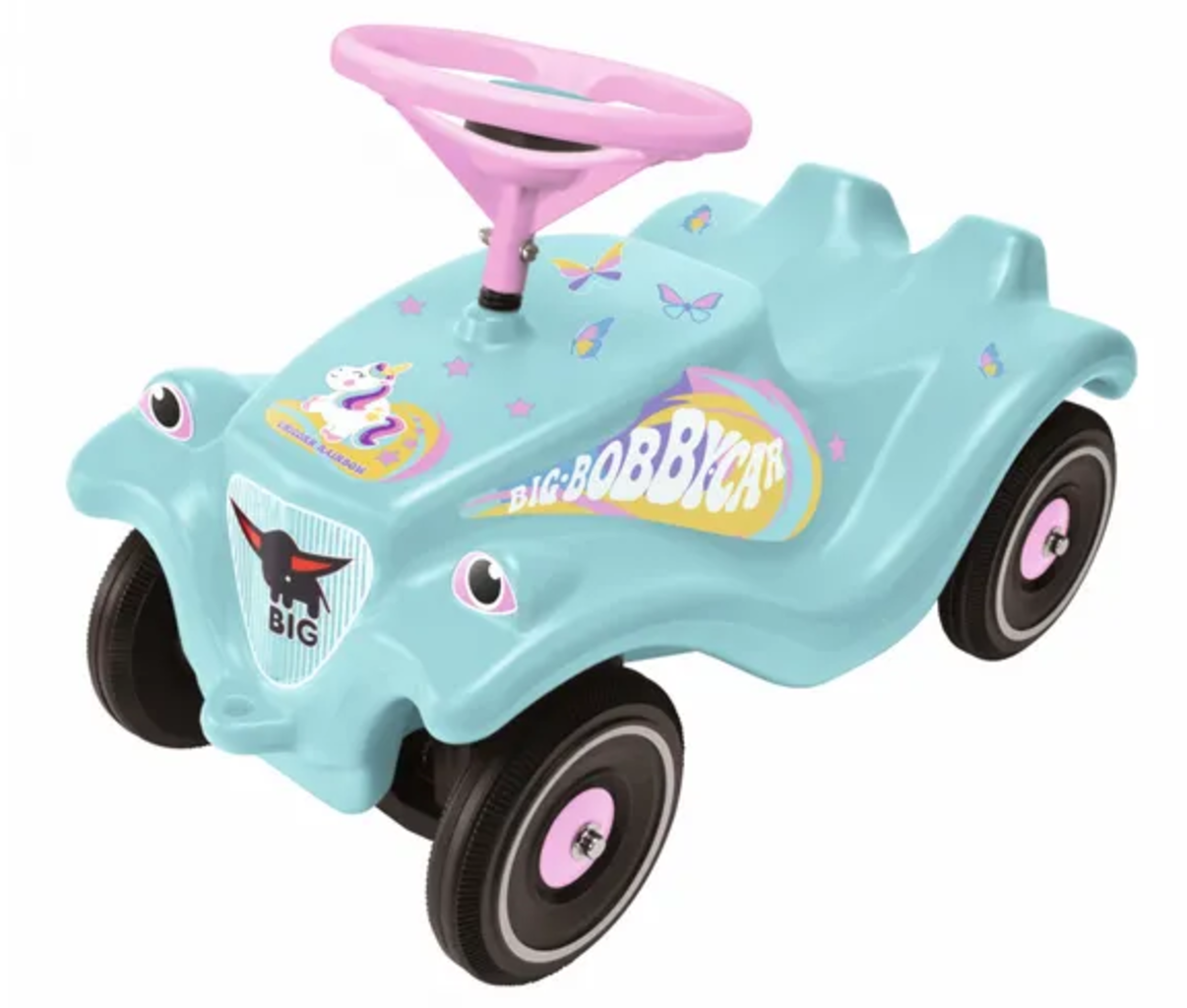 El Coche Bobby de la Edición Unicornio Clásico está decorado con bonitas mariposas y un simpático unicornio en el capó. Este correpasillos especial tiene una forma ergonómica y se adapta perfectamente a las necesidades de los niños pequeños. Además, está equipado con un volante de seguridad antideslizante, claxon mecánico y cuatro ruedas de plástico robustas y resistentes a la abrasión.