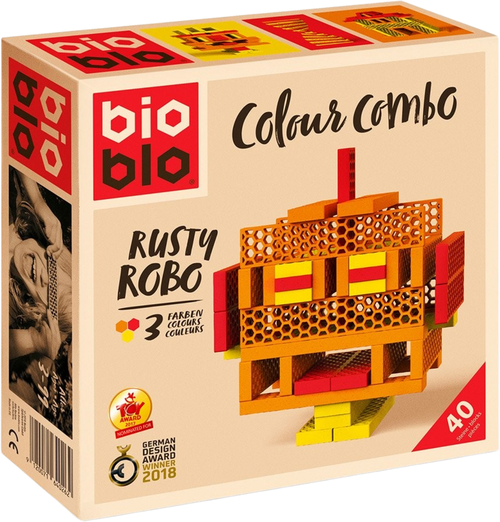 La MINI BOX - Rusty Robo - 40 Ladrillos "Rusty Robo" de Bioblo estimula la imaginación de los jóvenes inventores y de los entusiastas de la construcción. Los 40 ladrillos de colores cálidos y brillantes permiten jugar de forma intuitiva y atractiva, para crear robots y personajes originales basándose únicamente en el ingenio y la destreza manual. Perfecto como regalo o para ampliar tu colección Bioblo, combina creatividad y calidad sostenible.