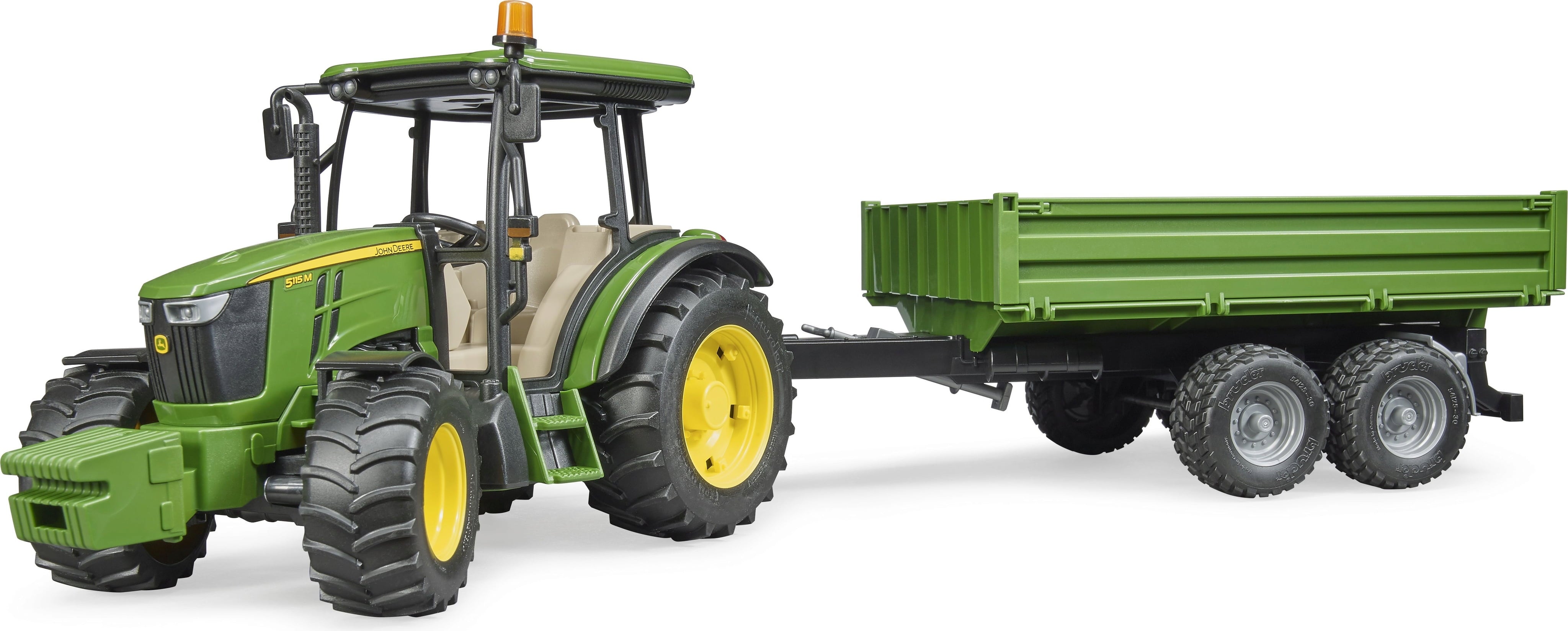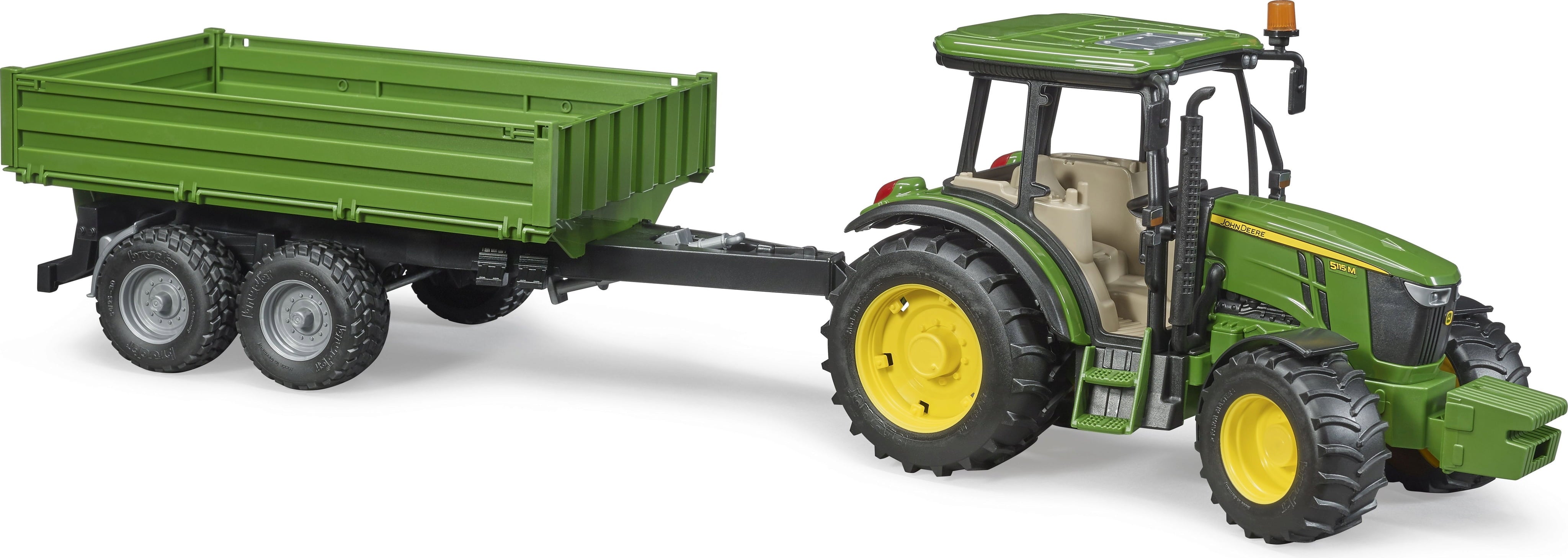 El John Deere 5115M con remolque abatible es el complemento perfecto para su granja de juguete. Su diseño compacto pero potente lo convierte en un multitalento. Se puede dirigir con precisión gracias al manillar adicional. El remolque en sí es fácil de acoplar, tiene laterales abatibles y una función de vuelco para facilitar la descarga.