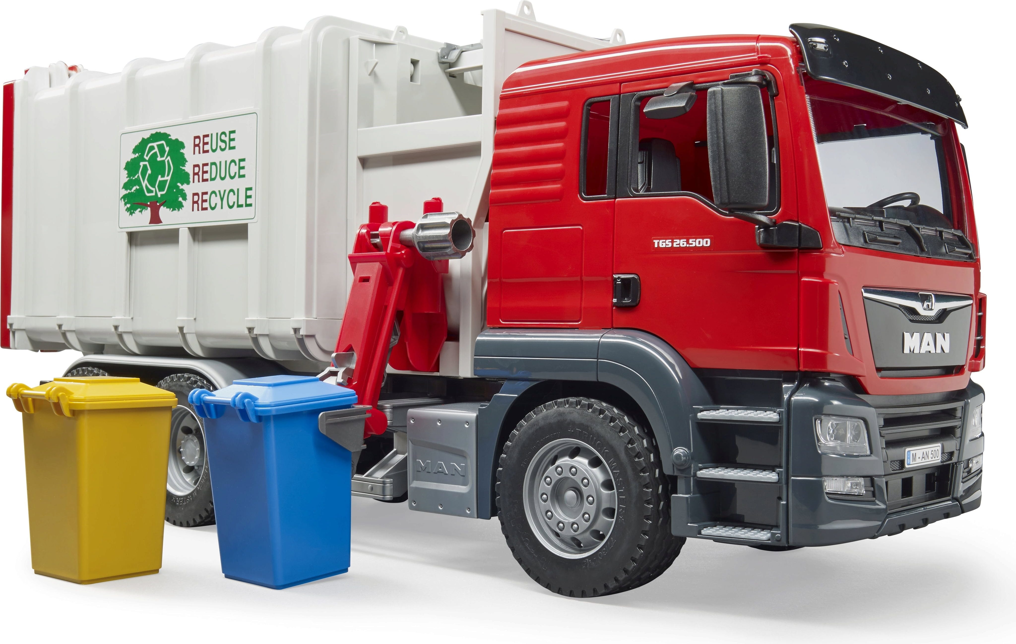 El camión de la basura MAN TGS, con su atención al detalle, muestra a los niños de forma lúdica cómo funcionan la recogida de residuos y el reciclaje. Gracias a las piezas móviles, el sinfín funcional y el brazo de carga, los más pequeños pueden recrear escenas realistas mientras aprenden la importancia de la responsabilidad y la protección del medio ambiente.