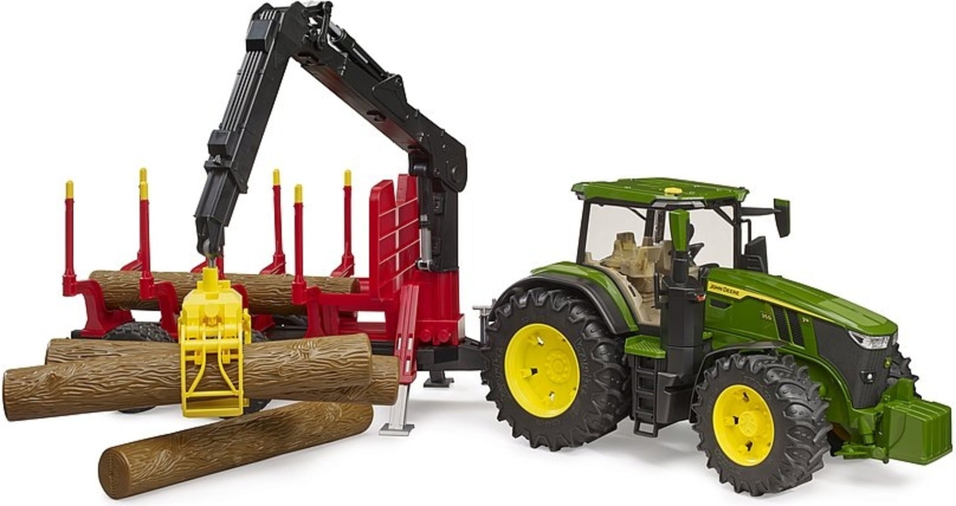 ¿Qué sería de la silvicultura moderna sin enormes tractores? Gracias a su reducido peso total, el John Deere 7R 350 es un compañero fiable para todos los forestales. Este modelo cuenta con una grúa de carga totalmente giratoria y un remolque con clavijas ajustables, que permite transportar los cuatro troncos por la habitación de los niños.