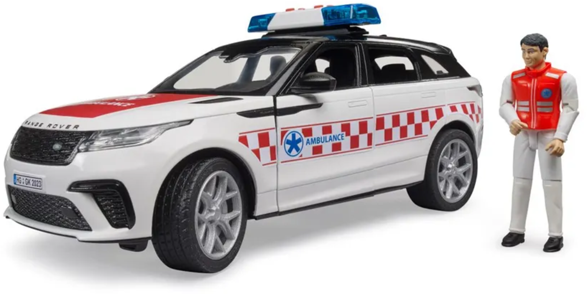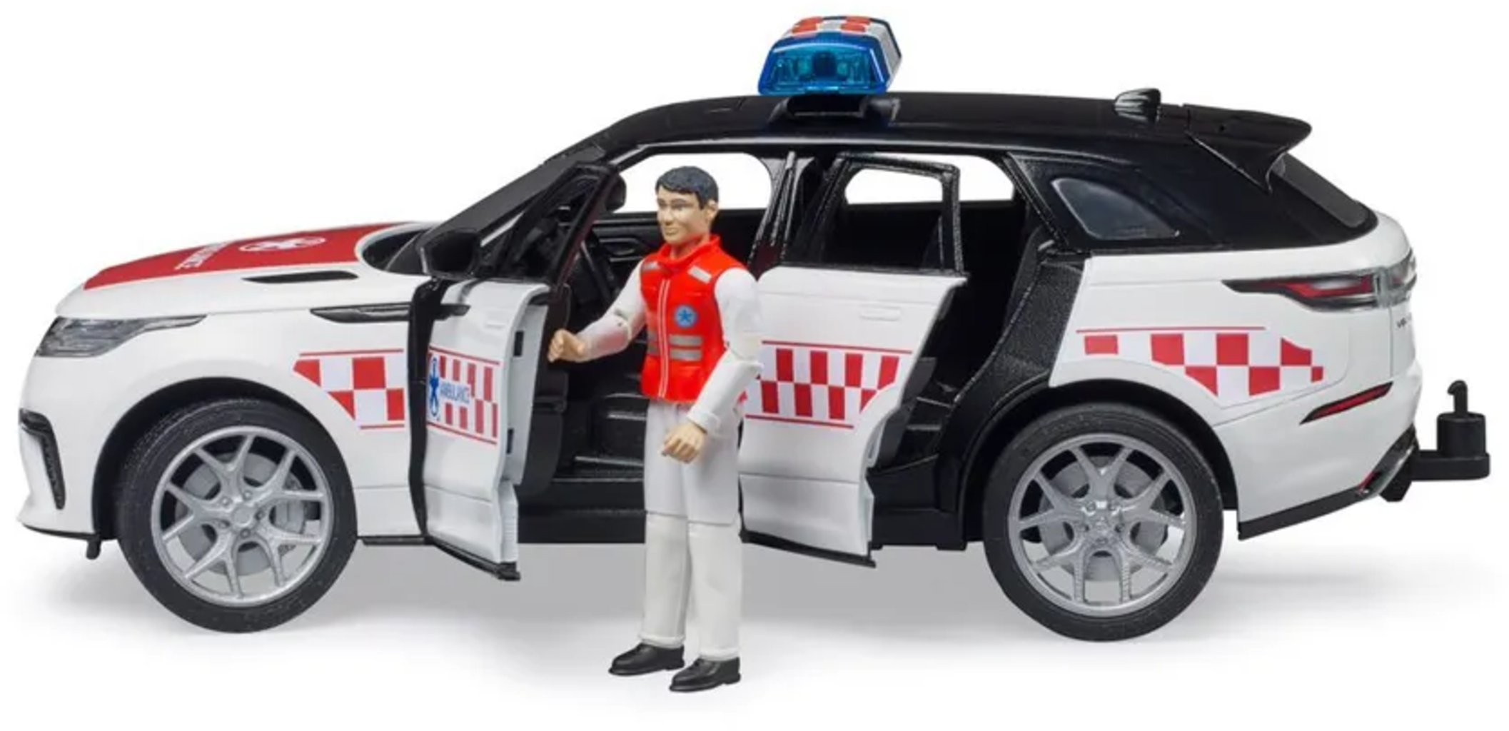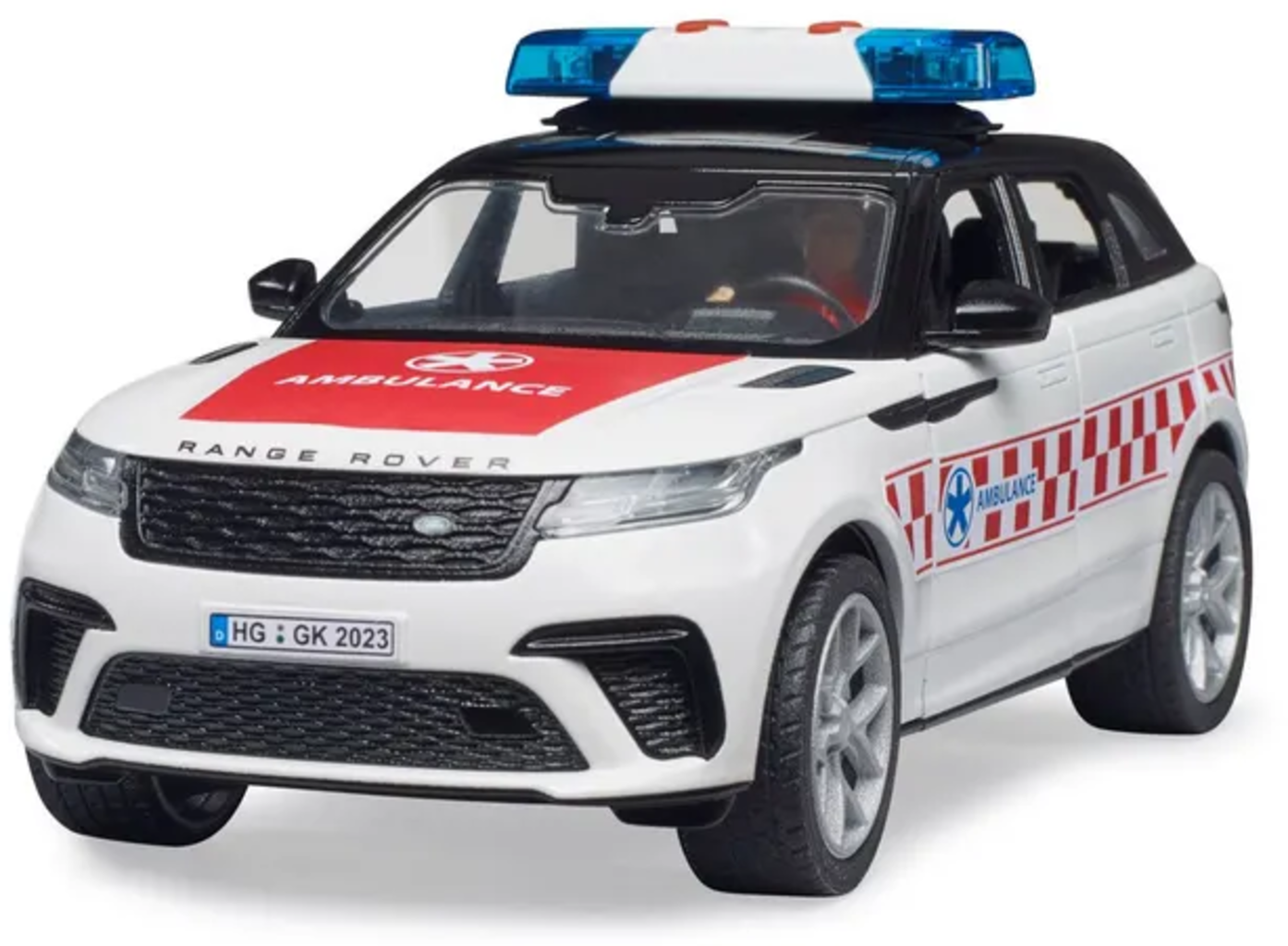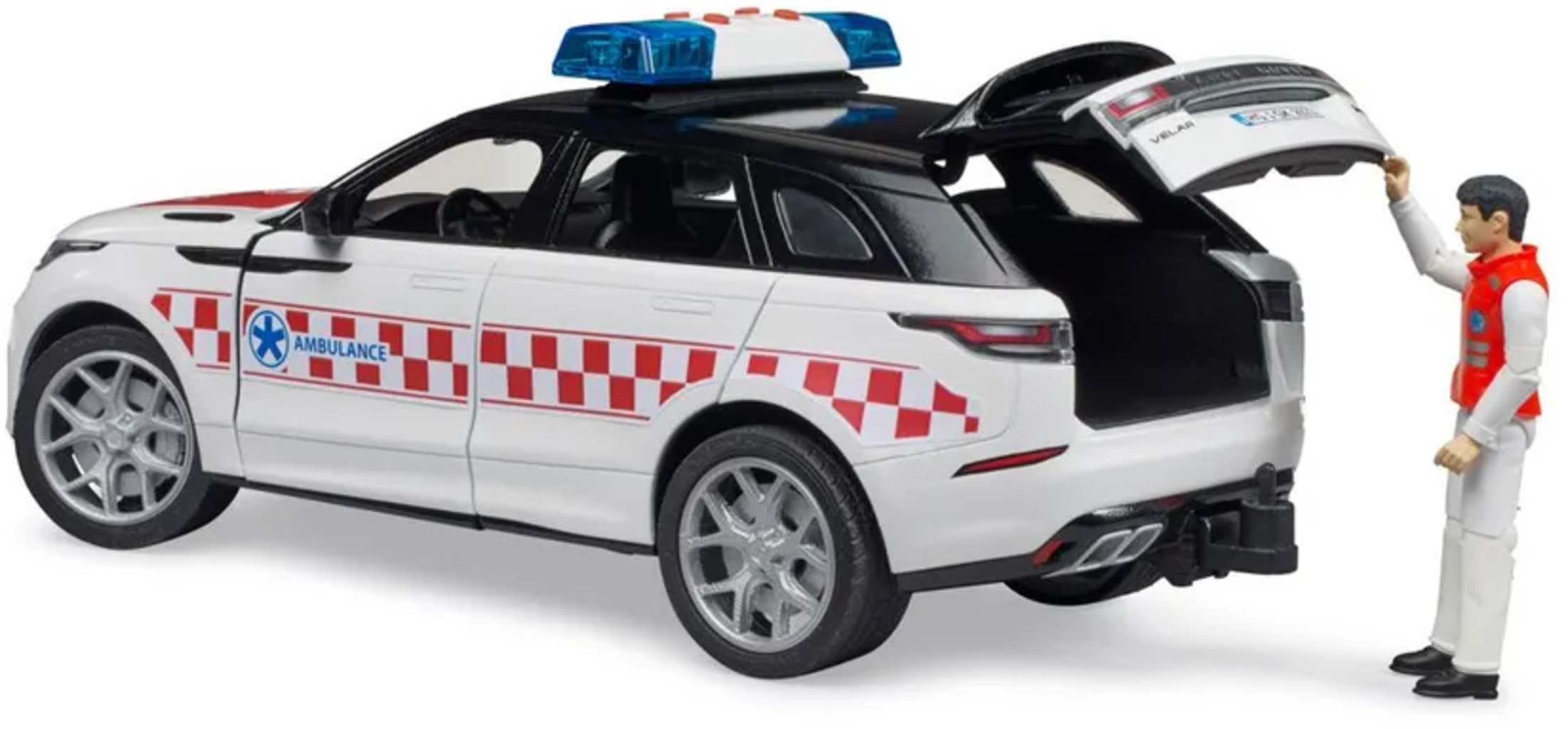 El Range Rover Velar es pionero en términos de diseño, eficiencia y prestaciones. Elegantemente diseñado por fuera y recreado al detalle por dentro, este modelo encarna una ambulancia de emergencia todoterreno. El complemento ideal para los vehículos de emergencia BRUDER. ¡Para jugar en interiores y exteriores!
