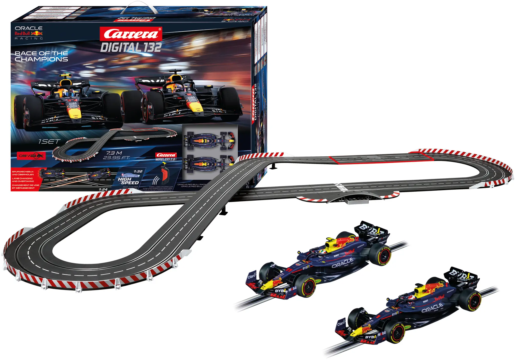 ¡Sumérgete en el duelo digital definitivo entre titanes de la Fórmula 1! El set Carrera DIGITAL 132 Race of Champions lleva la rivalidad entre Max Verstappen y Sergio Pérez a un desafiante circuito de 7,3 metros. Experimenta la máxima libertad y un control preciso con los mandos de mano WIRELESS 2.0 y decide tu estrategia de carrera con los cambios de carril digitales