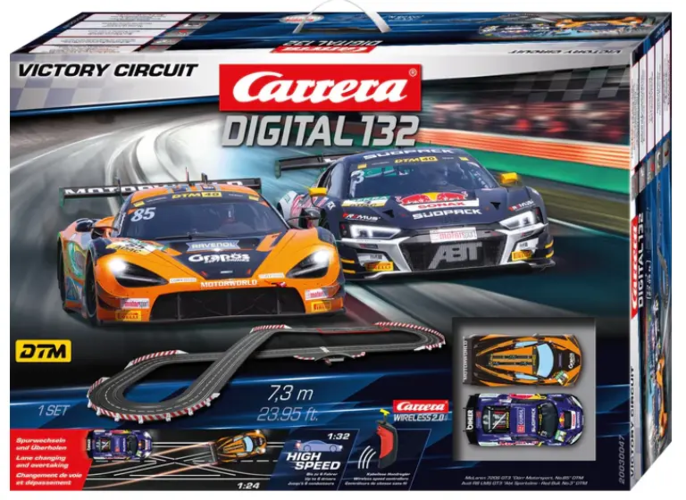 Experimenta la adrenalina de las carreras del DTM en el salón de tu casa. En la pista a escala 1:24 de 7,3 metros de longitud, podrás explotar al máximo la velocidad y el manejo de los dos campeones de GT3. Tanto si quieres conseguir tiempos de vuelta rápidos como utilizar estratégicamente el doble interruptor para realizar el cambio de carril decisivo, este set es la forma perfecta de iniciarte en las carreras digitales.