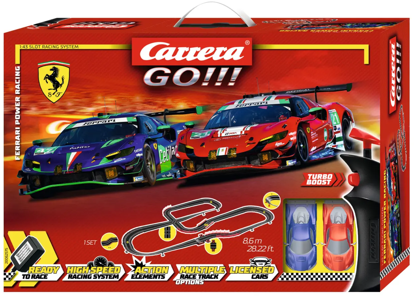 ¡¡¡Con Carrera GO!!! - Ferrari Power Racing, todos los fans del fabricante italiano de automóviles deportivos podrán disfrutar de un juego de carreras. El desafiante circuito con cuentavueltas transforma el salón de tu casa en un auténtico escenario de carreras. Dos Ferrari 296 GT3 ya están en la línea de salida: ¿qué coche de carreras ganará?