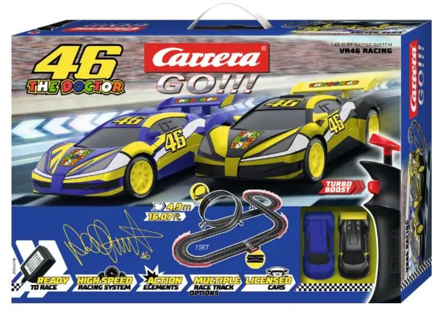 Valentino Rossi es uno de los pilotos de MotoGP más exitosos y populares de todos los tiempos. ¡¡¡El Carrera GO!!! - VR46 Ultimate Racing es un homenaje al nueve veces campeón del mundo. Aquí, dos coches de carreras GT luchan por la victoria. Ambos llevan el número 46, el número inicial y de la suerte de Rossi. La pista con secciones estrechas y bucles proporciona pura emoción.