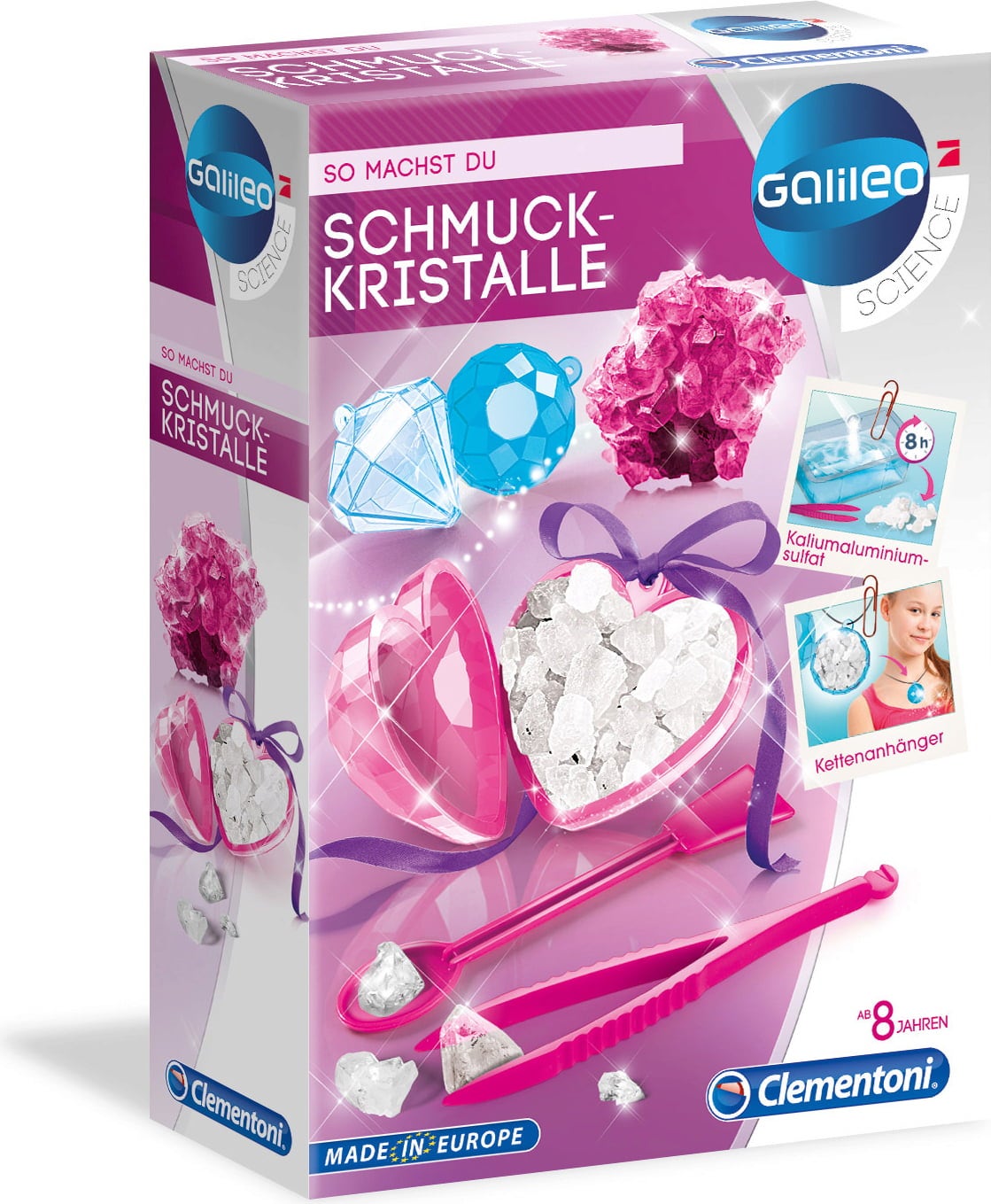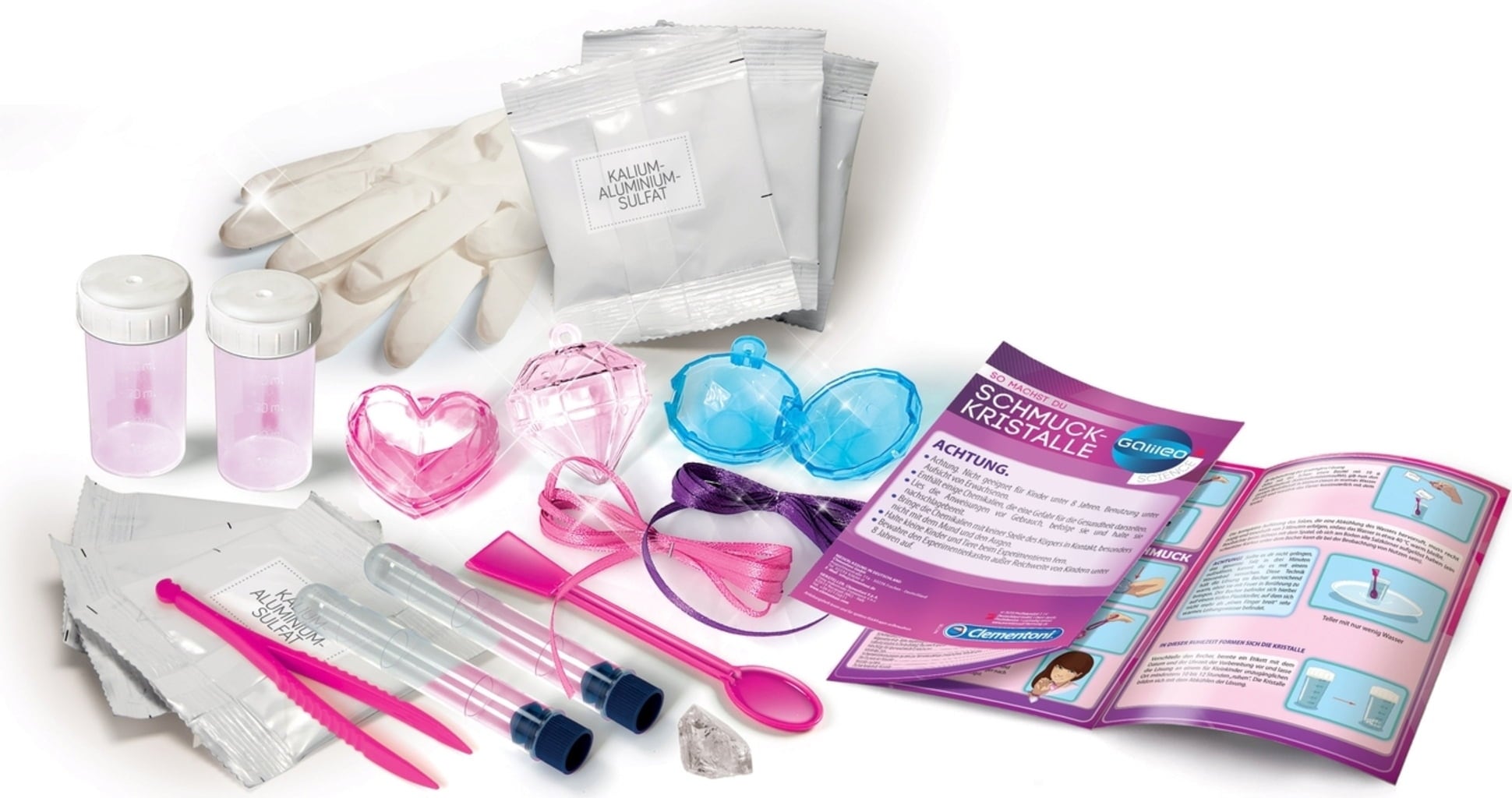 Con este kit de química Clementoni podrás crear brillantes joyas y cristales que luego podrás llevar colgados del cuello. Las instrucciones detalladas describen todas las herramientas y te guían paso a paso por el proceso.