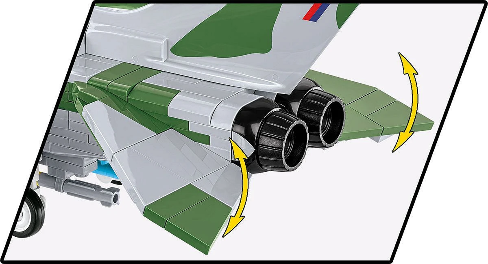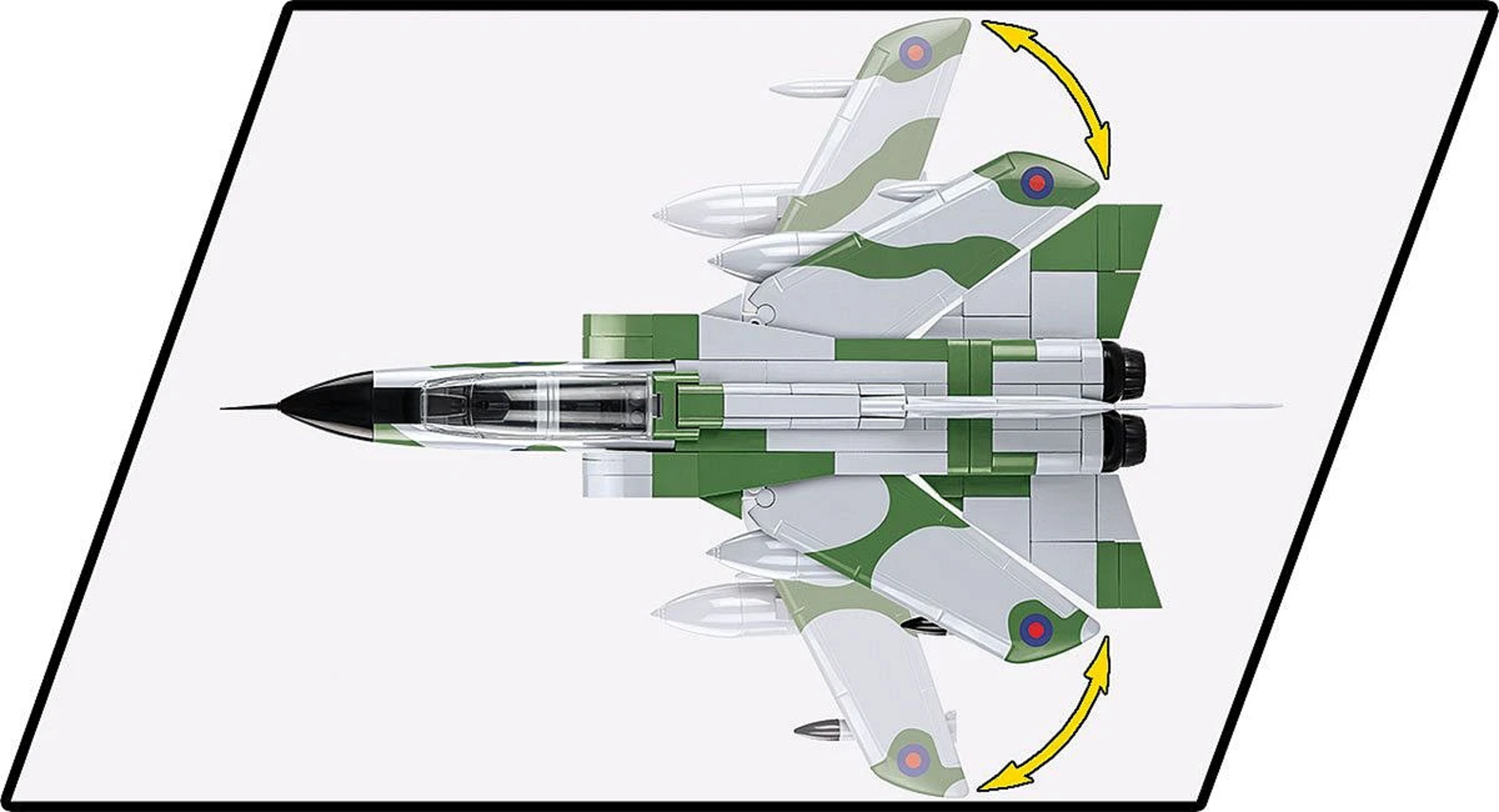 El Panavia Tornado destaca en una versión especial con un exclusivo diseño de camuflaje, pensado para realzar su impacto visual. Sus alas de geometría variable reproducen fielmente el funcionamiento del avión real y pueden orientarse para simular vuelos a alta velocidad.