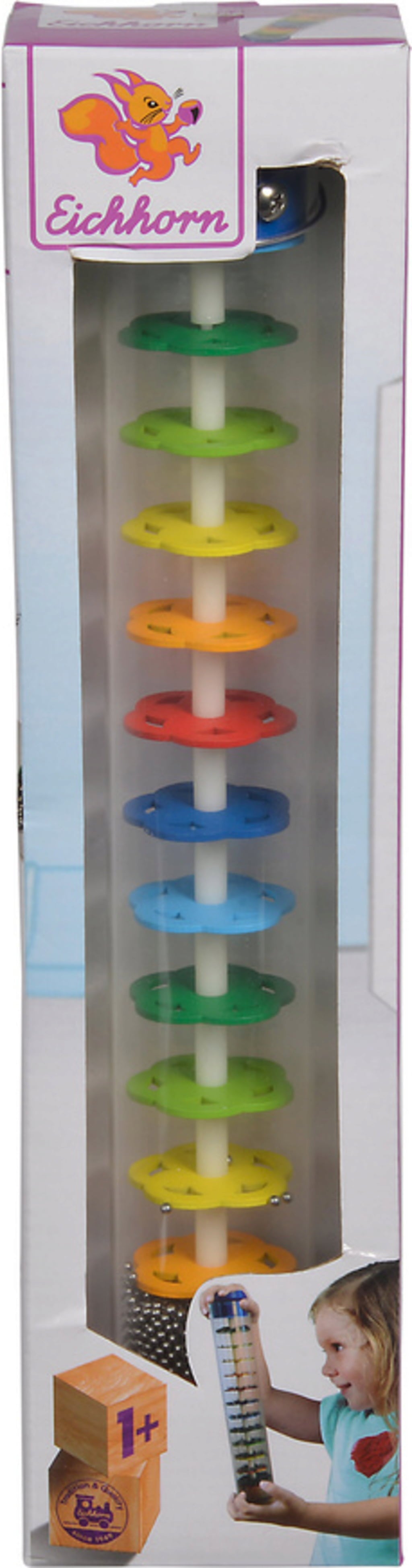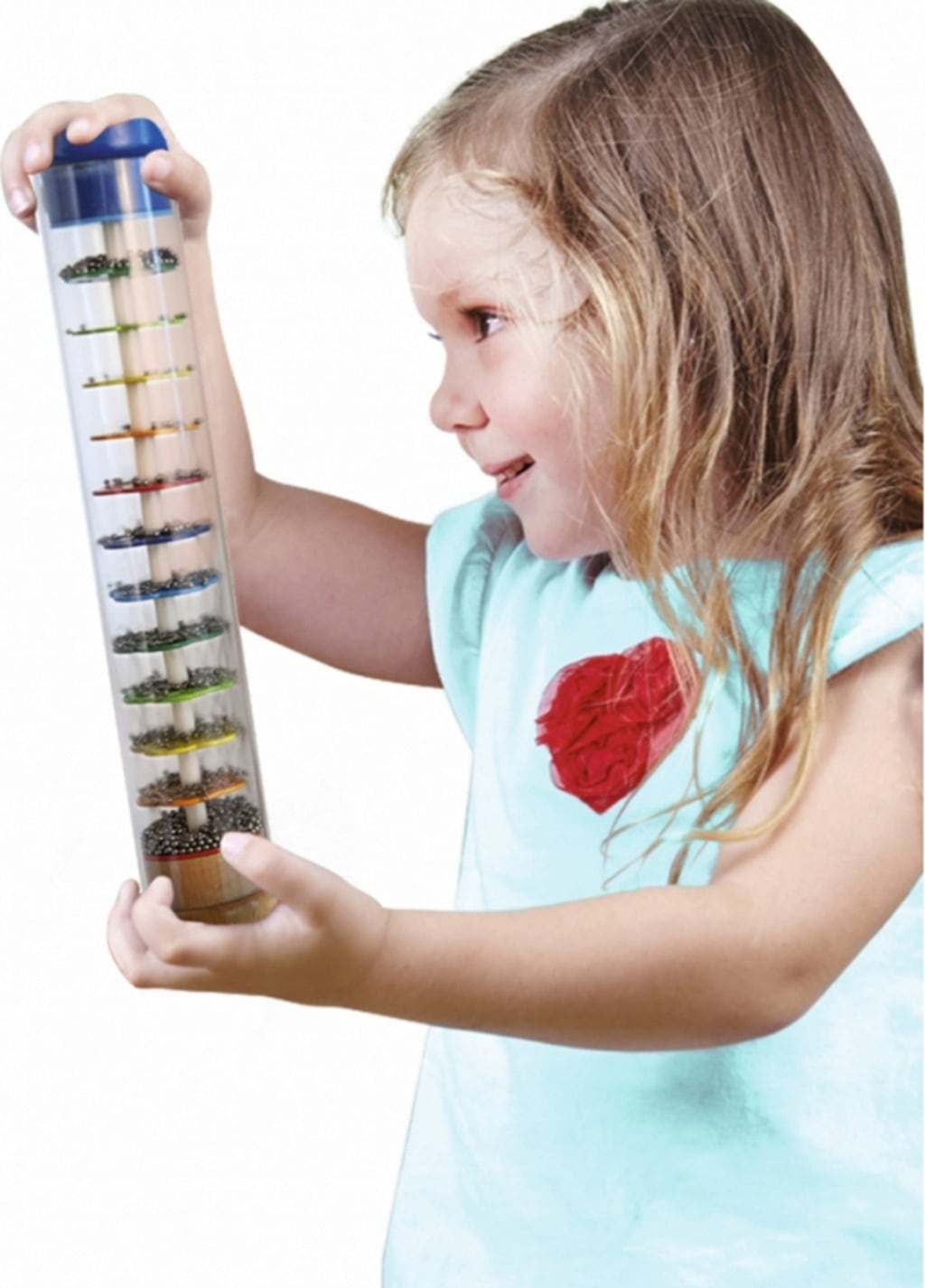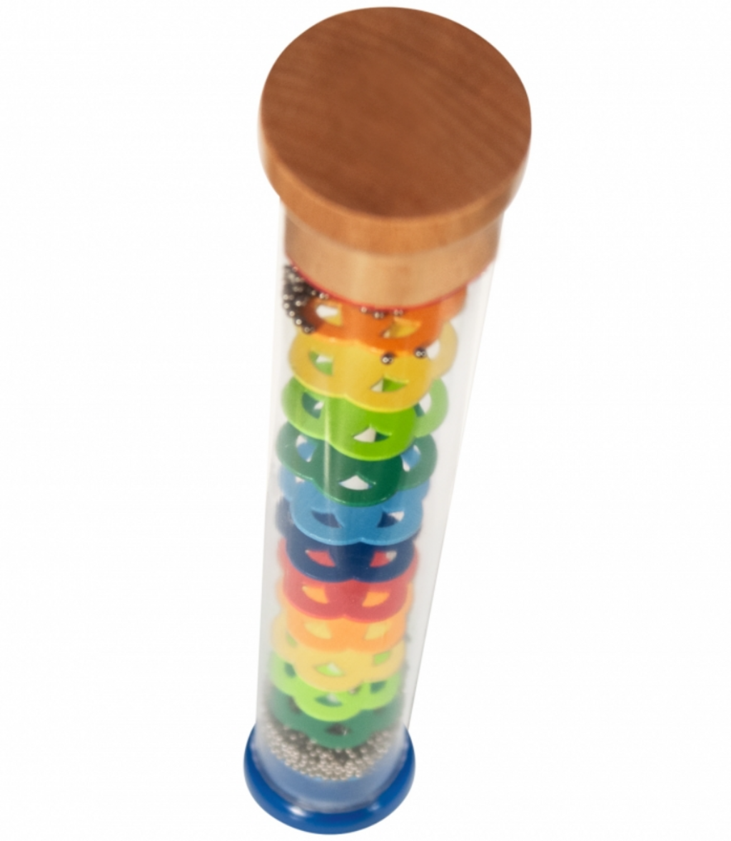 Con este ingenioso palo de lluvia, los niños a partir de 12 meses pueden crear fantásticos efectos sonoros. Si el instrumento se pone boca abajo, las bolas de metal de su interior ruedan sobre las capas de colores y crean sonidos únicos que recuerdan a un agradable chaparrón. Dependiendo de la inclinación, se puede influir en la velocidad de las bolas y, por tanto, en el volumen del sonido de lluvia.