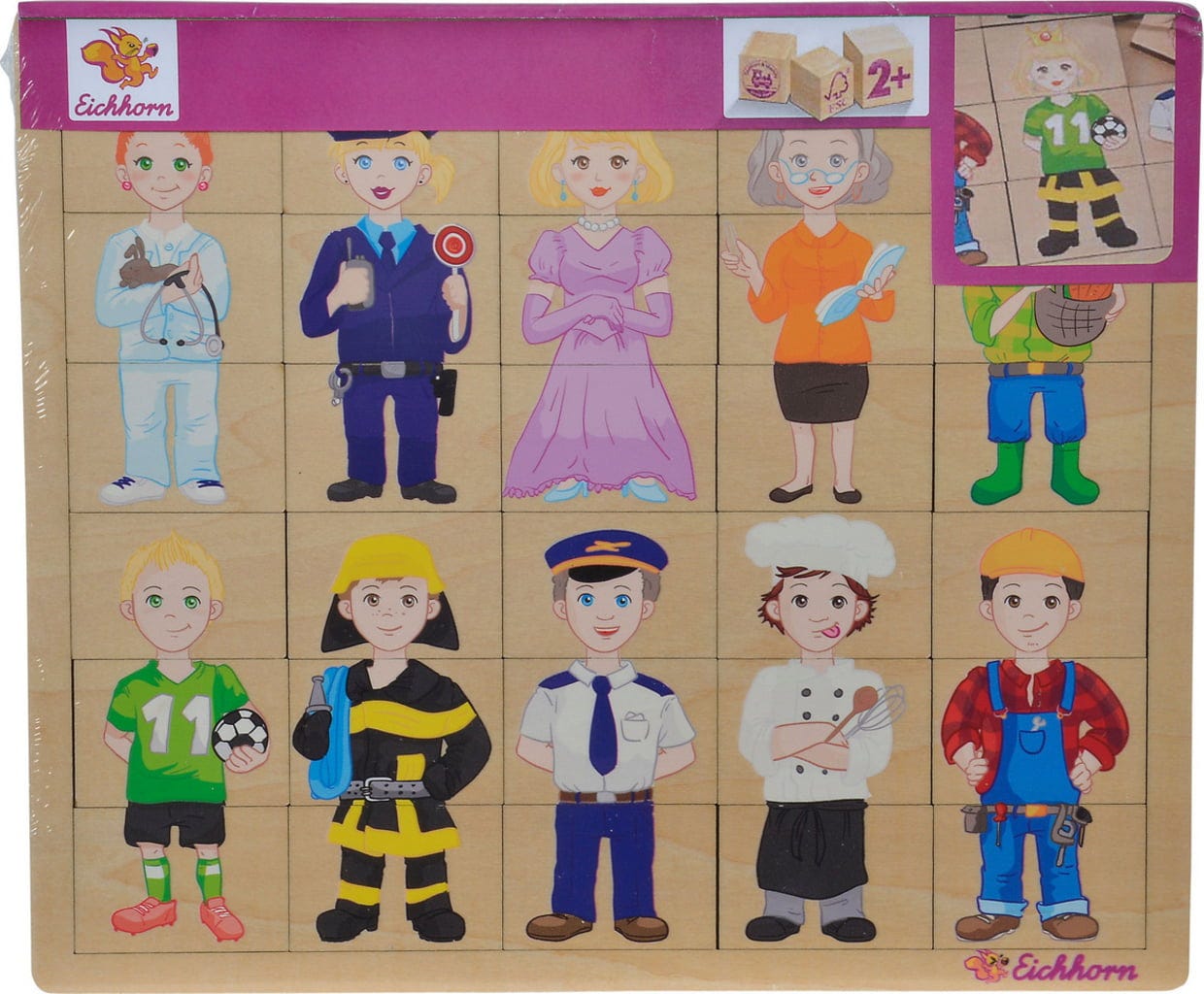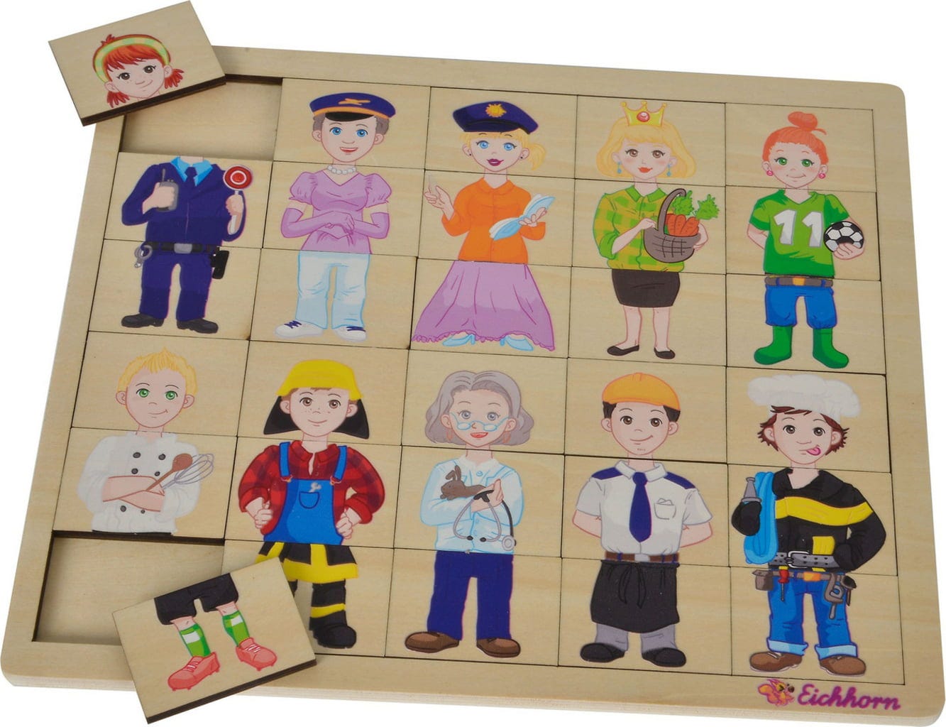 Con este puzzle de madera cuidadosamente diseñado, incluso los niños más pequeños pueden aprender sobre el variado mundo del trabajo. Además de un policía, un médico y un piloto, hay muchas otras profesiones apasionantes que descubrir en el puzzle. Las piezas individuales pueden desmontarse y combinarse para formar otras personas llenas de imaginación