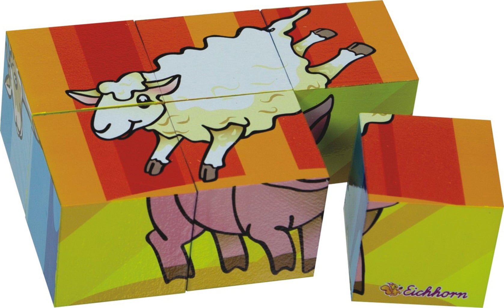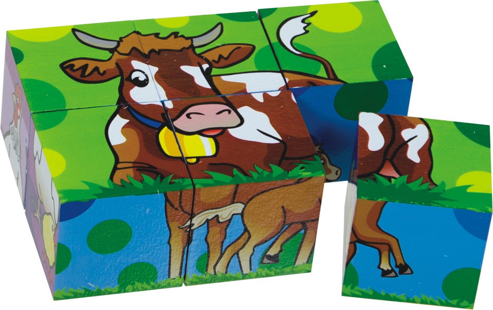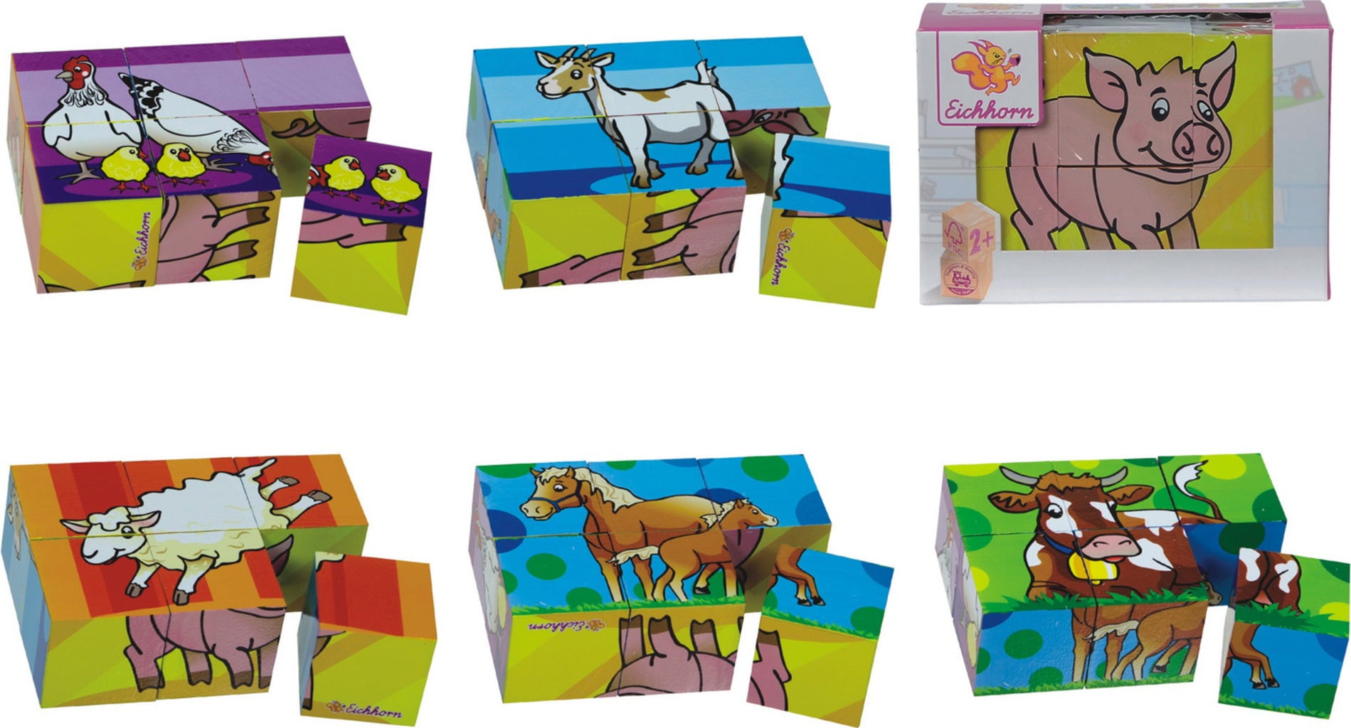 Los seis cubos de este gran rompecabezas se pueden ordenar en coloridos patrones que representan simpáticos animales de granja. Al construir y jugar con los cubos, también se entrena la coordinación mano-ojo de forma lúdica.