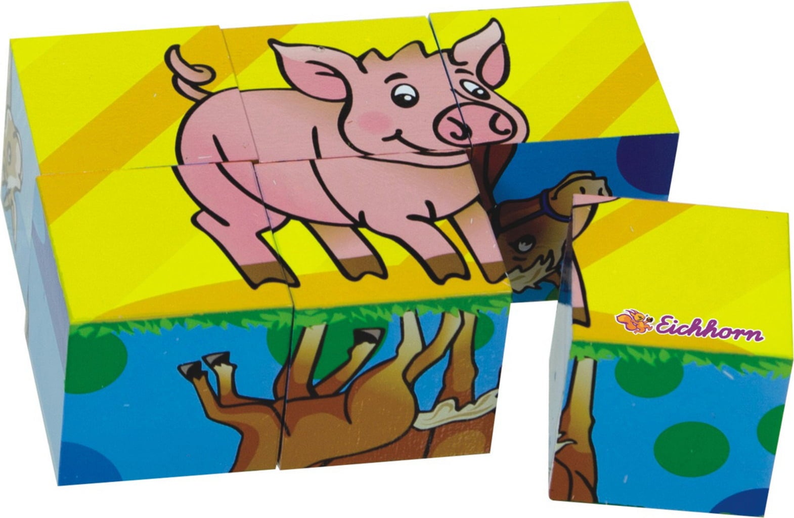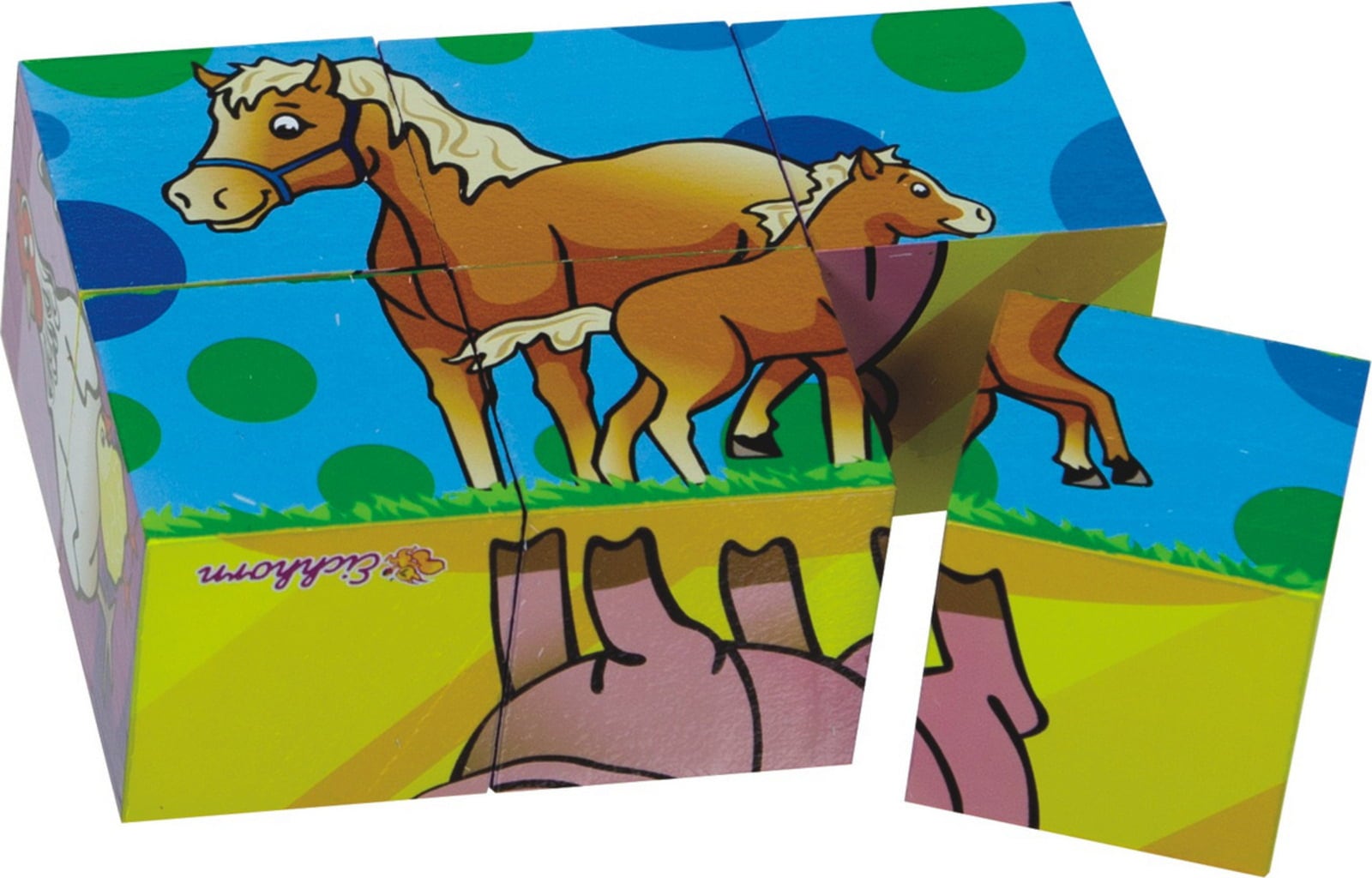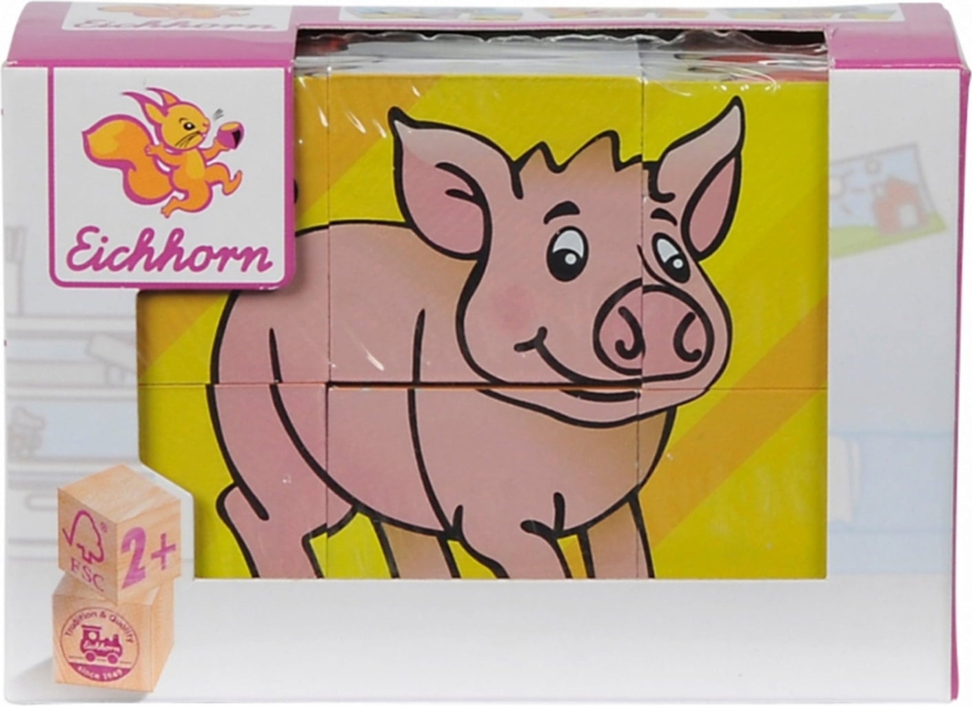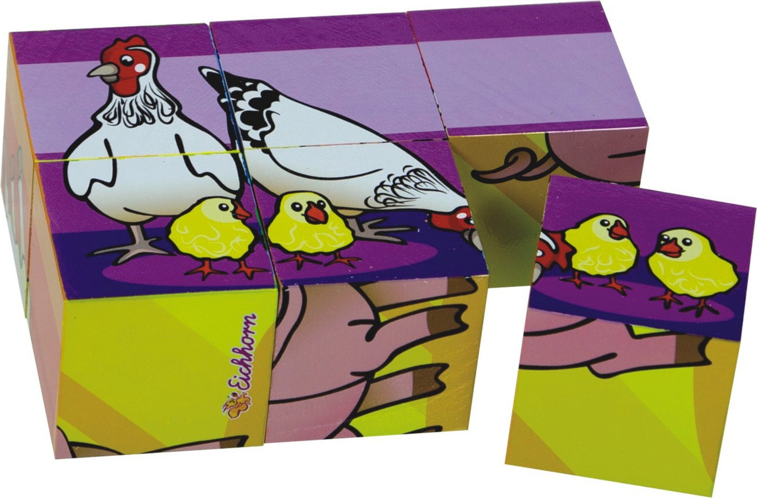 Los seis cubos de este gran rompecabezas se pueden ordenar en coloridos patrones que representan simpáticos animales de granja. Al construir y jugar con los cubos, también se entrena la coordinación mano-ojo de forma lúdica.