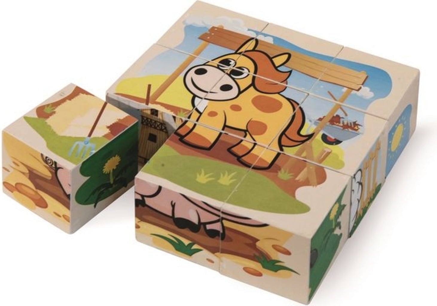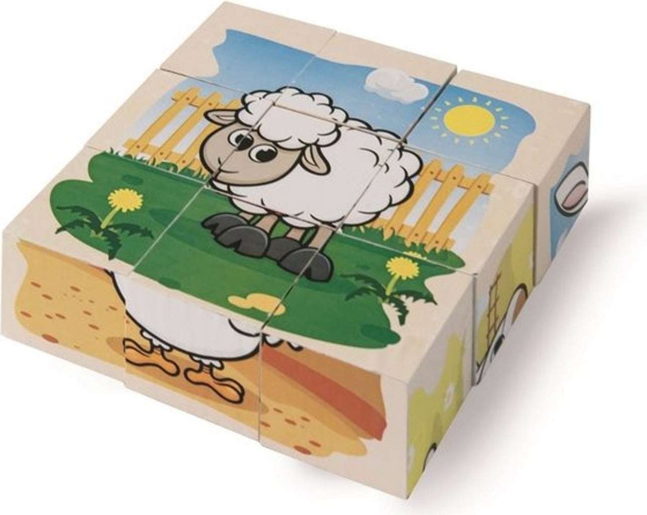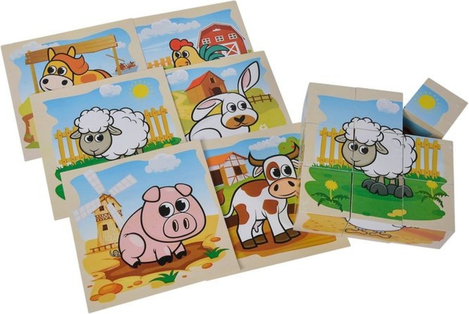 Este juego con 6 grandes posibilidades encanta con los adorables animales representados: conejo, gallo, oveja, caballo, vaca y cerdo. También incluye 6 modelos de dibujos, que ayudan a los más pequeños en su construcción.