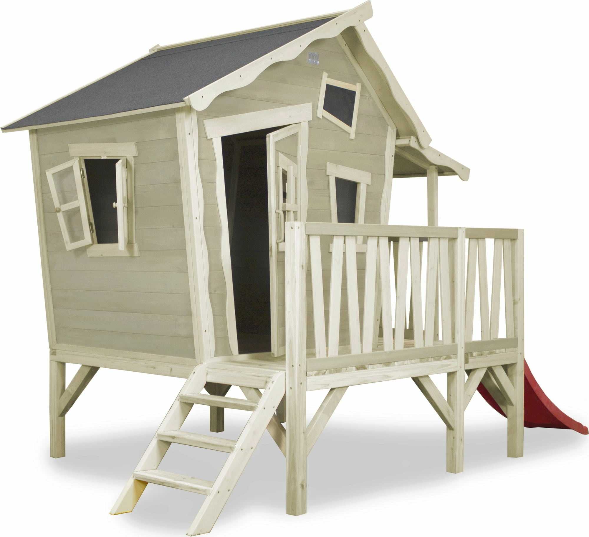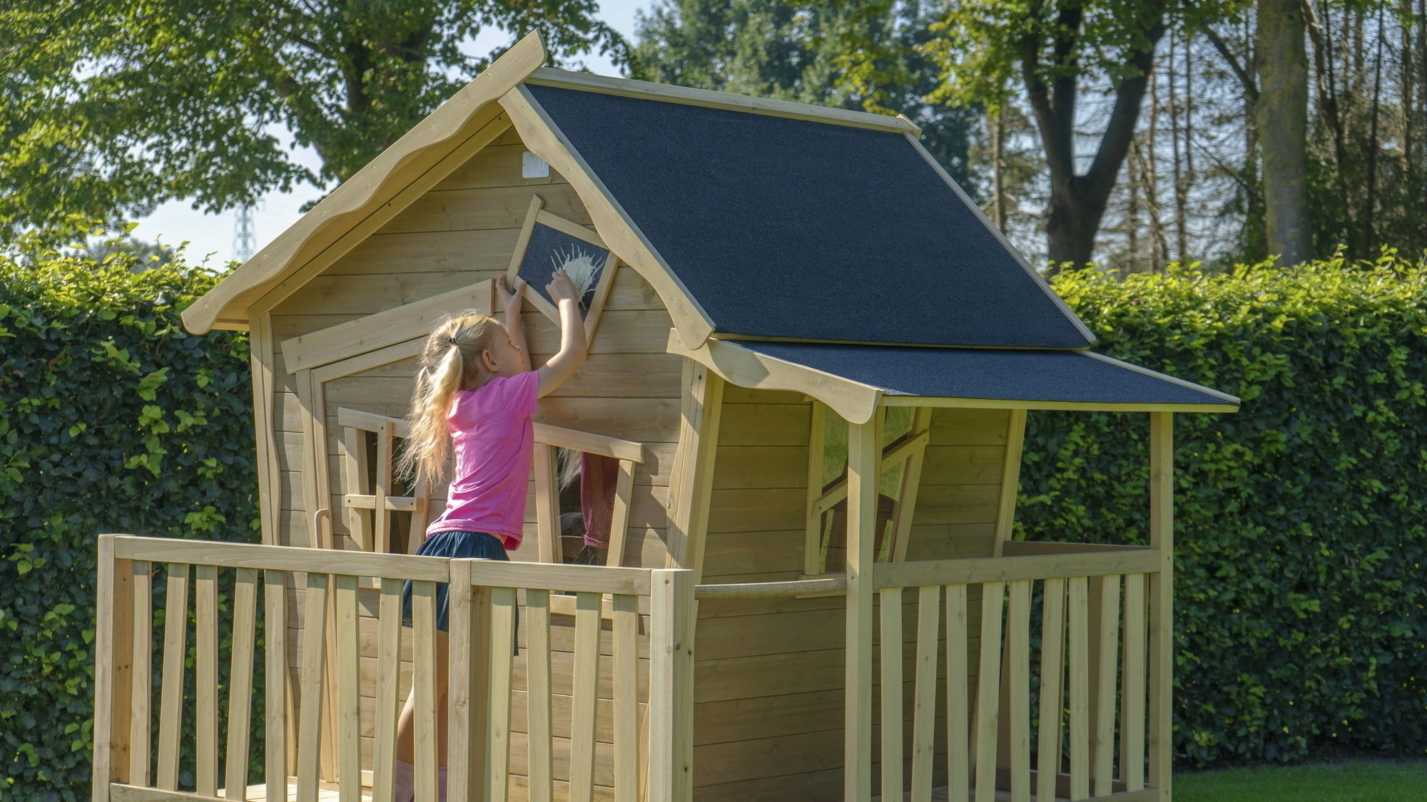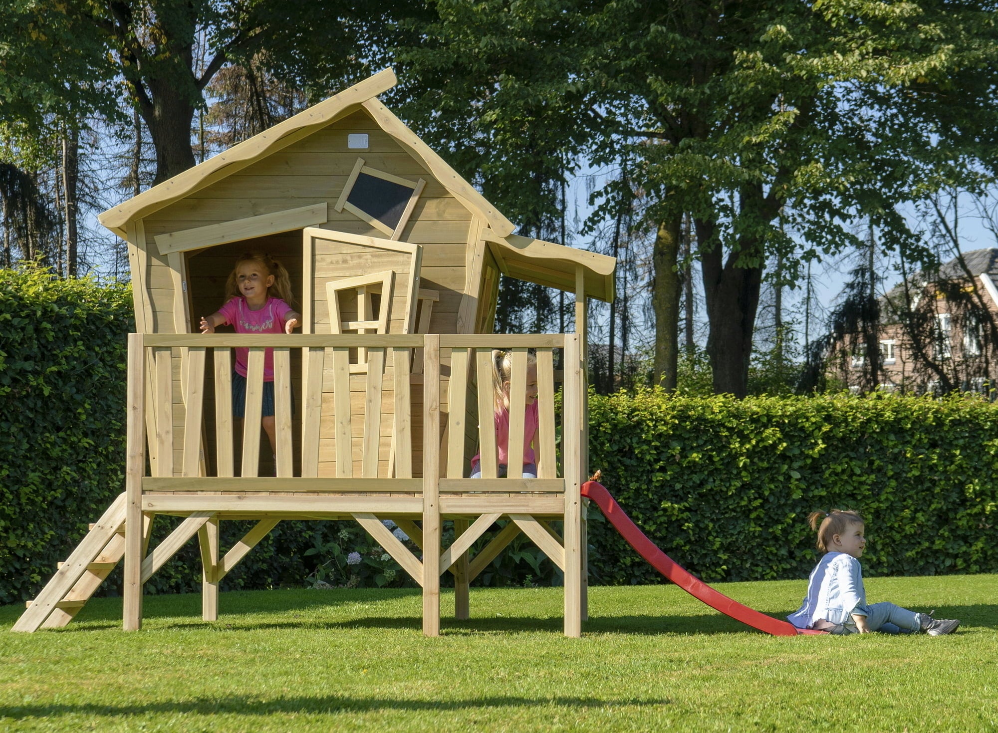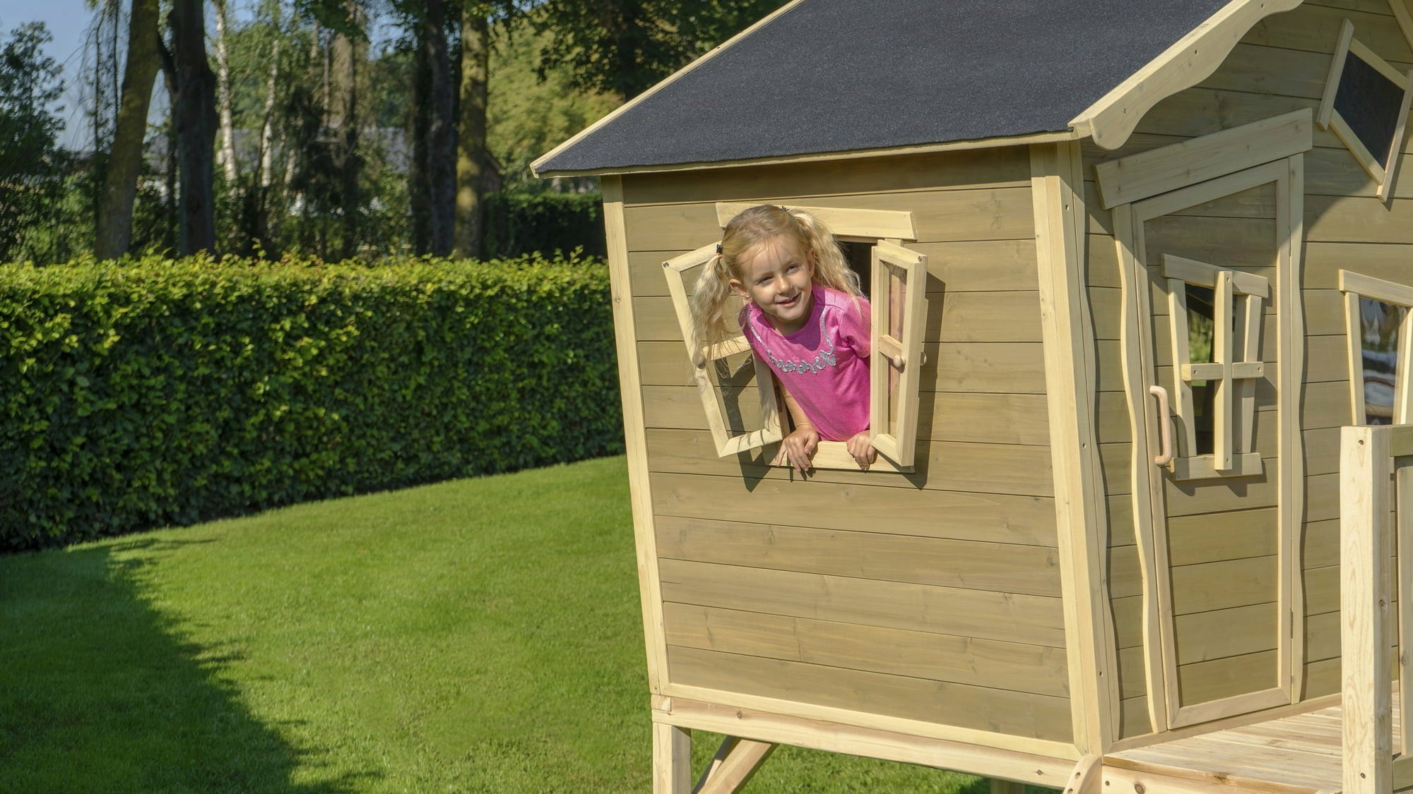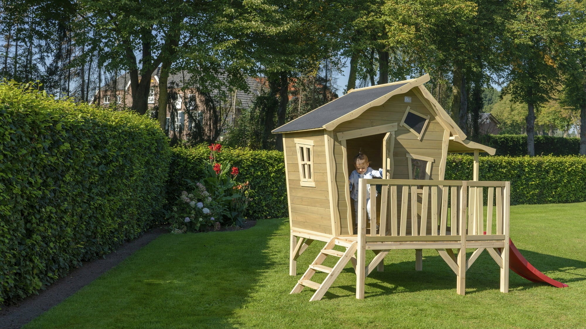 ¿Qué niño no sueña con tener su propia casita de juegos en el jardín? La casita de madera Crooky 350 de EXIT Toys es duradera y resistente a la intemperie. Tiene un porche, un tobogán y un tejado de betún impermeable y está hecha de madera de cedro duradera. Los componentes premontados hacen que el montaje sea rápido y sencillo. La madera no se astilla y es resistente al desgaste, por lo que tus hijos podrán disfrutar durante mucho tiempo.
