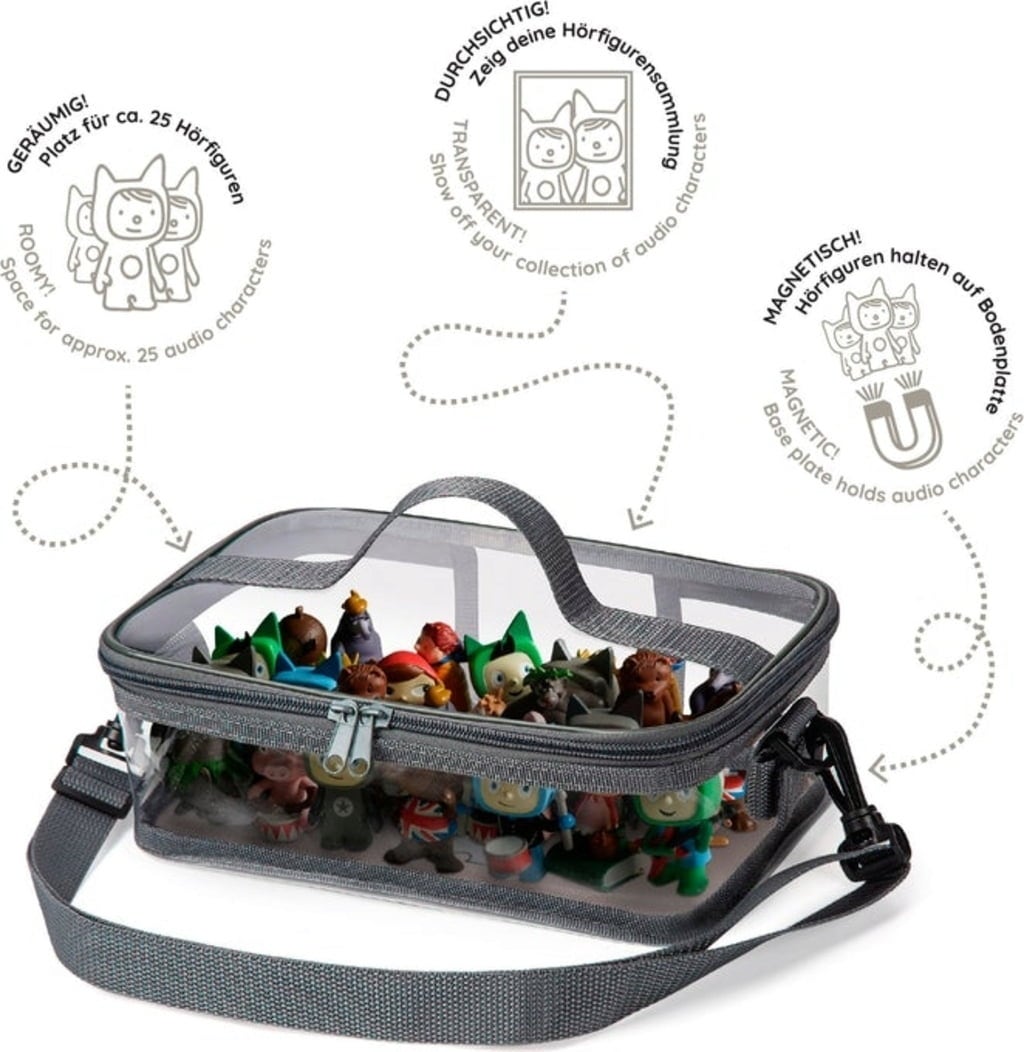 En esta bolsa se pueden guardar y transportar de forma segura hasta 30 Tonies y, gracias a la base magnética, cada uno estará bien sujeto en su sitio. Los laterales transparentes permiten tener siempre a la vista la colección y encontrar mucho más rápido los personajes que se buscan. Esta bolsa también se puede combinar en unos sencillos pasos con la bolsa Fantifant Toniebox.