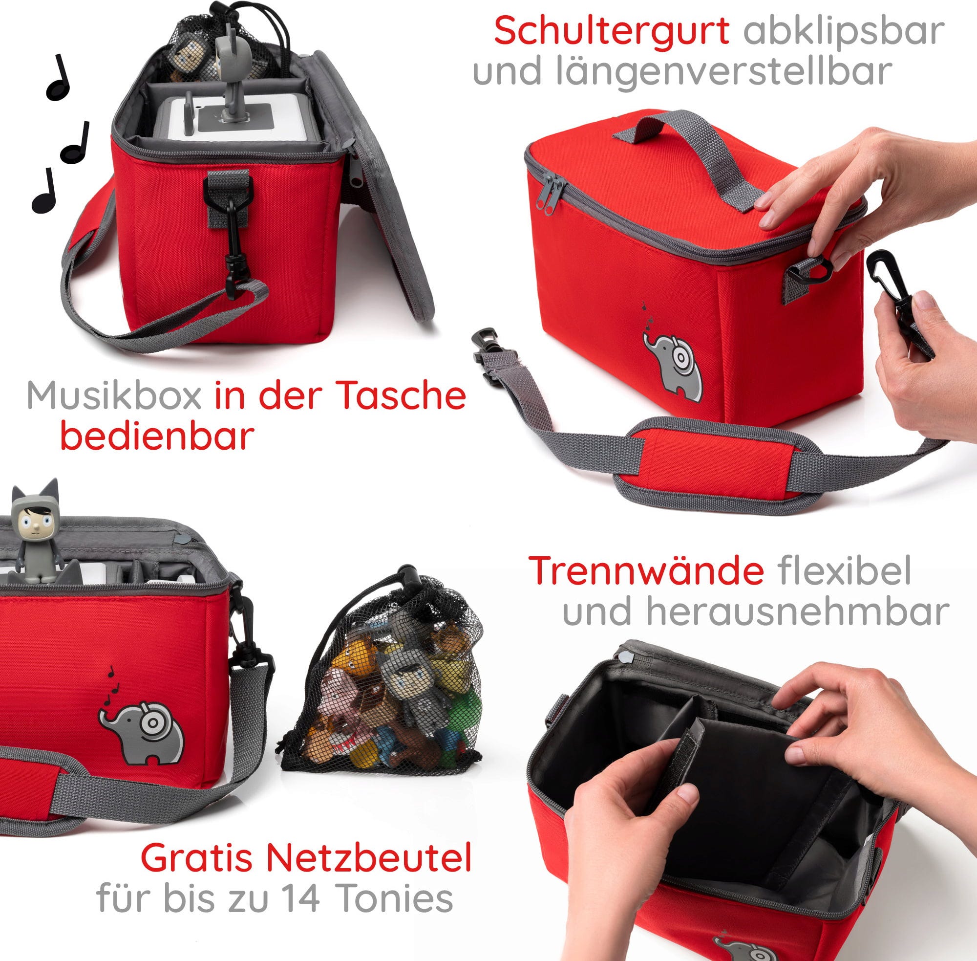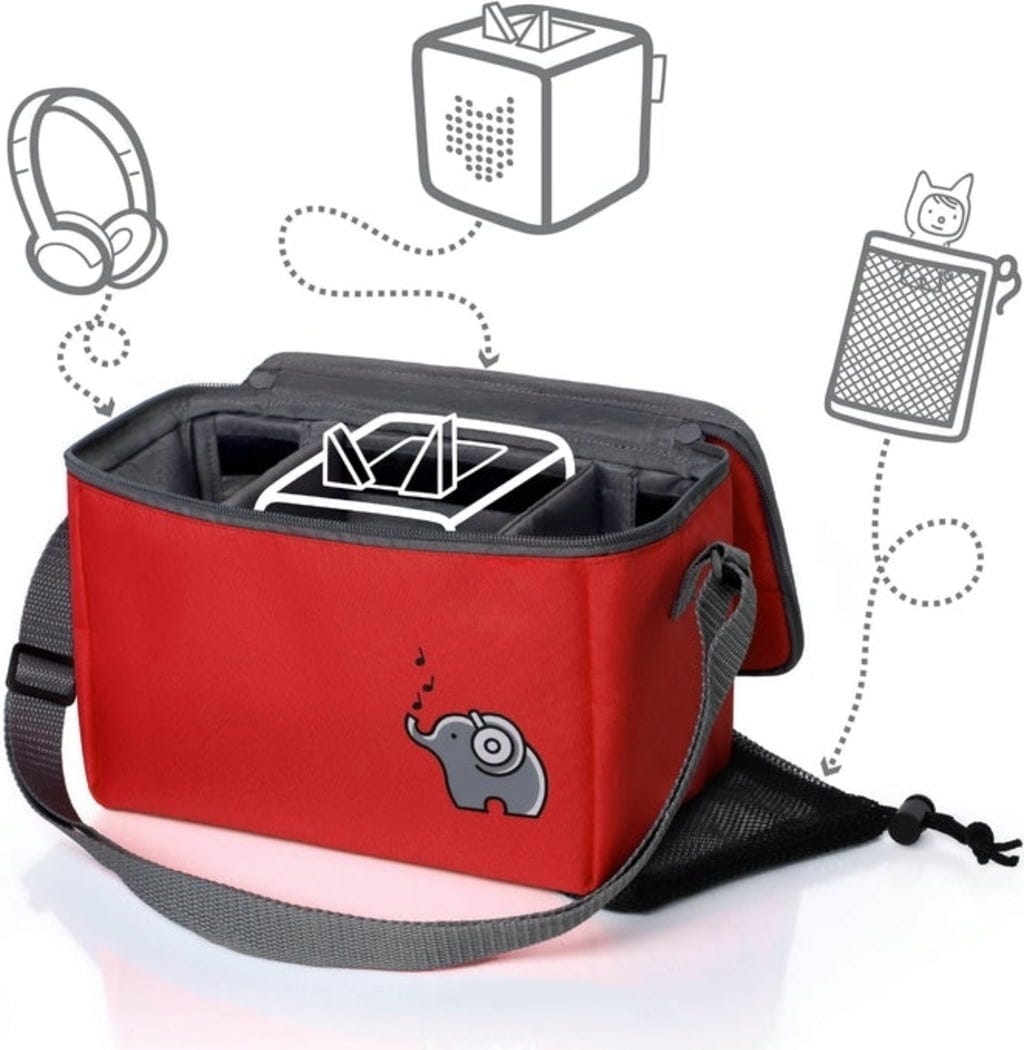 Colorida bolsa con mucho espacio para el Toniebox y tus personajes favoritos. La bolsa de red incluida ofrece espacio adicional para otros accesorios. El tamaño de los compartimentos interiores se puede ajustar mediante correas de velcro. La tapa se puede abrir completamente y permite utilizar el Toniebox también en la bolsa.