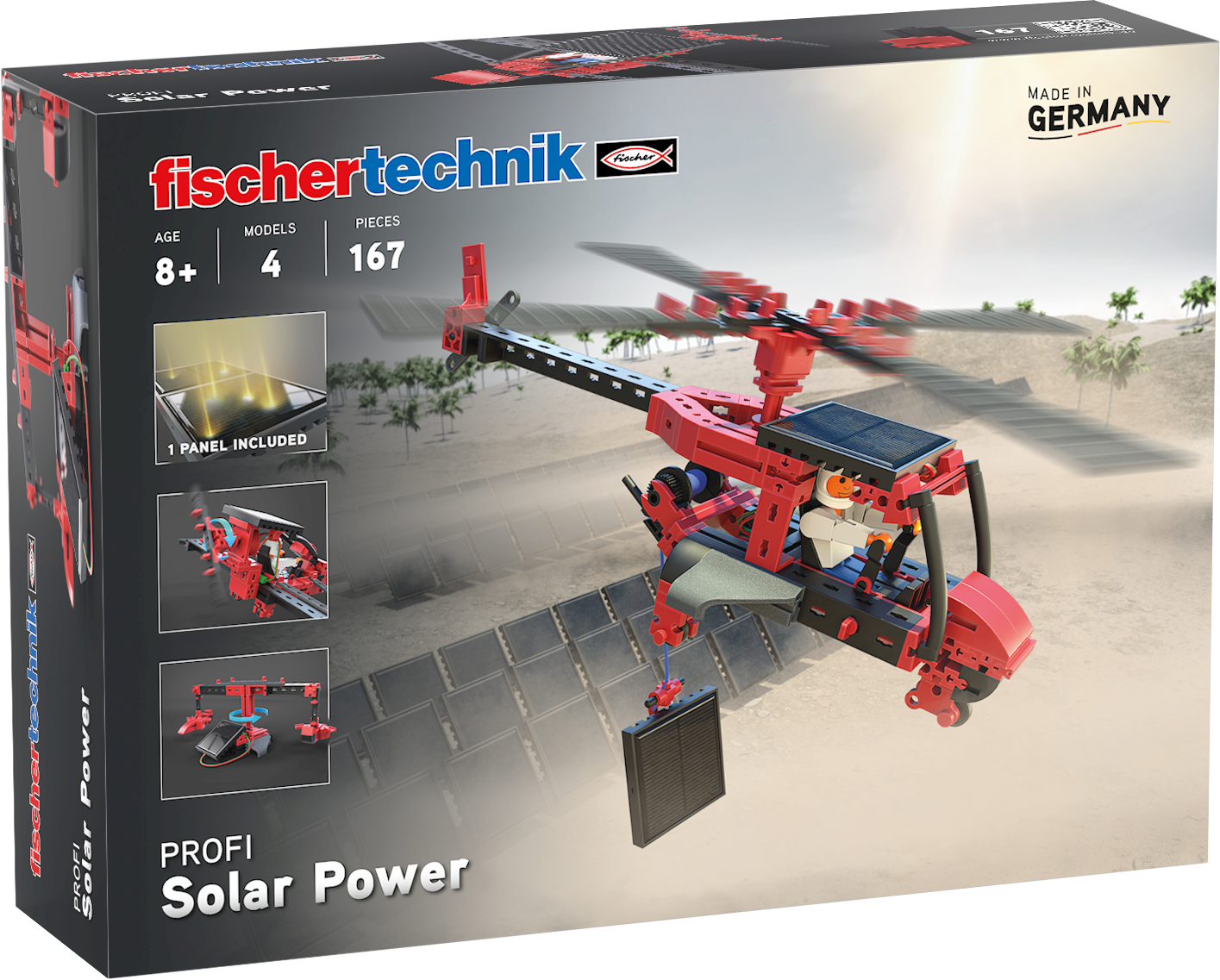 Con PROFI Solar Power, los niños experimentan de cerca el poder de la energía solar. Helicópteros, aviones, turbinas y tiovivos se ponen en movimiento gracias al módulo solar incluido. Los jóvenes inventores descubren de forma práctica las energías del futuro y amplían sus conocimientos sobre tecnología y sostenibilidad. Un set perfecto para jóvenes investigadores curiosos.