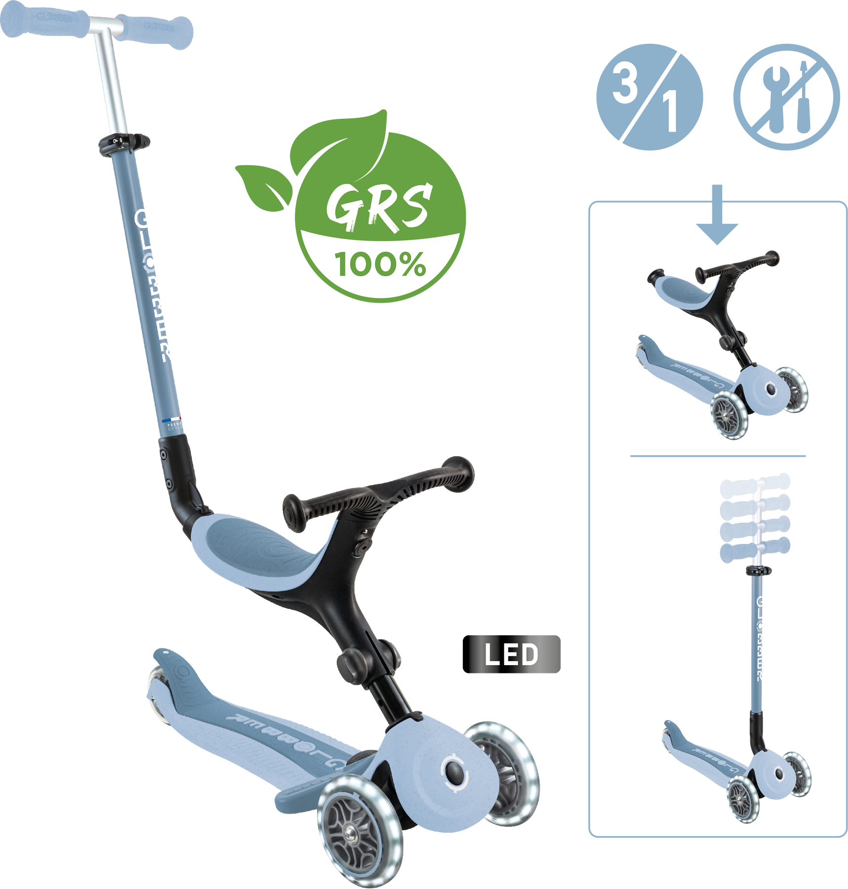 El patinete Go-Up Active Lights Eco combina sostenibilidad y funcionalidad. Los padres pueden contar con un modelo 3 en 1 duradero que se transforma de un patinete con asiento a un patinete clásico, ideal para muchos años.