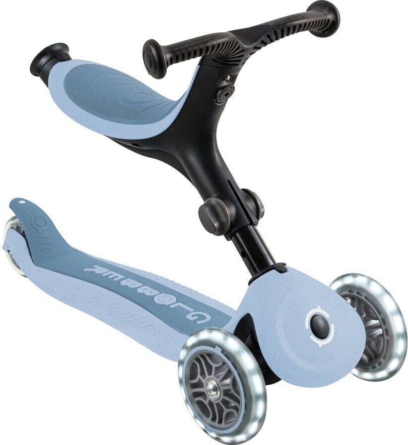 El patinete Go-Up Active Lights Eco combina sostenibilidad y funcionalidad. Los padres pueden contar con un modelo 3 en 1 duradero que se transforma de un patinete con asiento a un patinete clásico, ideal para muchos años.