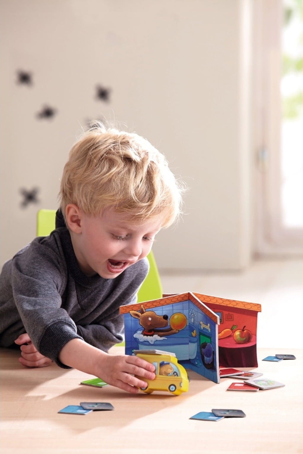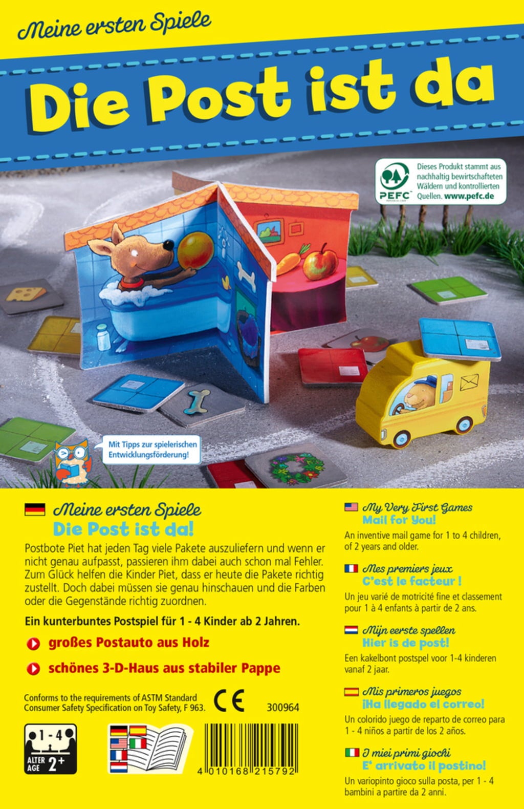 Contenido: 1 vehículo postal con cartero, 1 casa, 12 tarjetas de paquete, instrucciones.