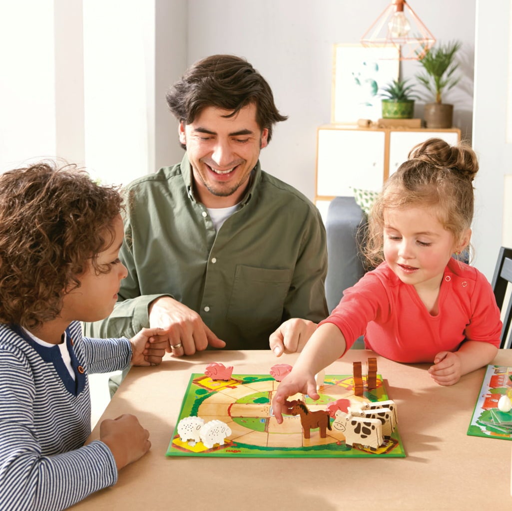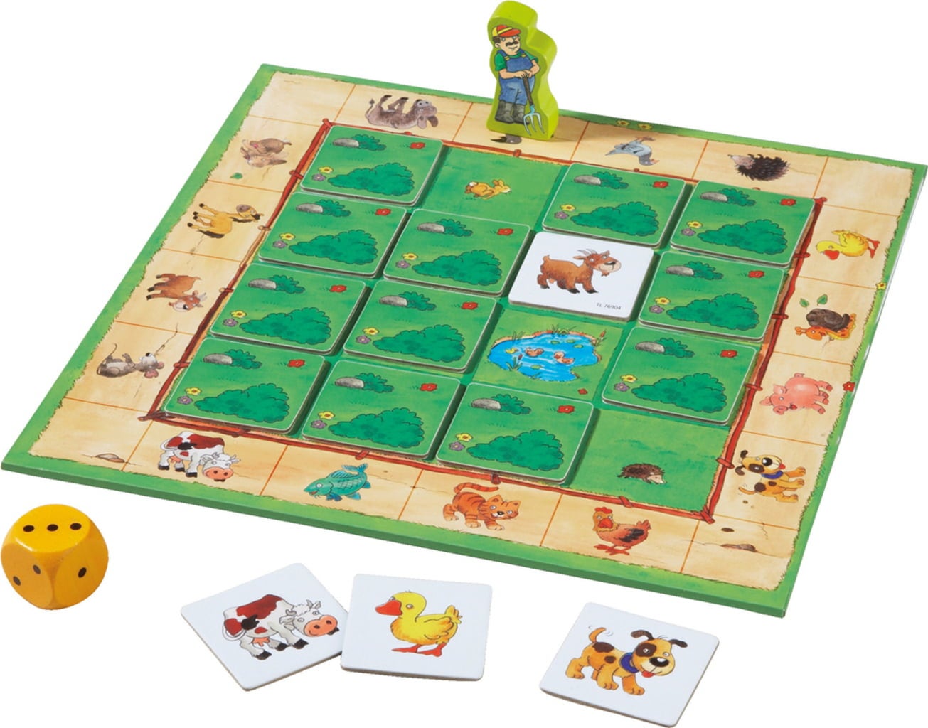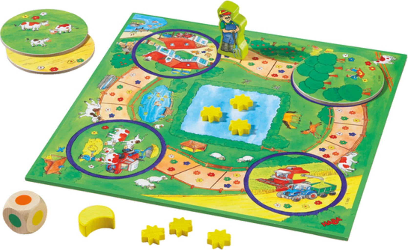 Contenido: 3 caballos, 3 vacas, 3 cerdos, 3 ovejas, 2 manzanas rojas, 2 ciruelas, 2 huevos, 2 lonchas de queso, 2 ensaladas, 2 zanahorias, 1 granjero, 1 dado, 1 dado de colores, 9 estrellas, 1 luna, 1 set de instrucciones.