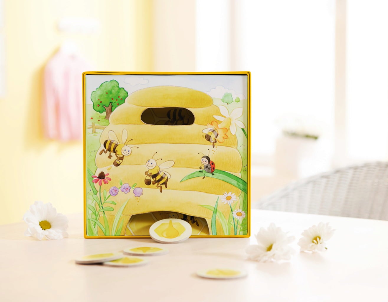 Contenido: 1 colmena (= inserto y fondo de la caja), 1 abeja Adela, 10 fichas de flores, 1 tarro de miel, 1 dado, instrucciones.