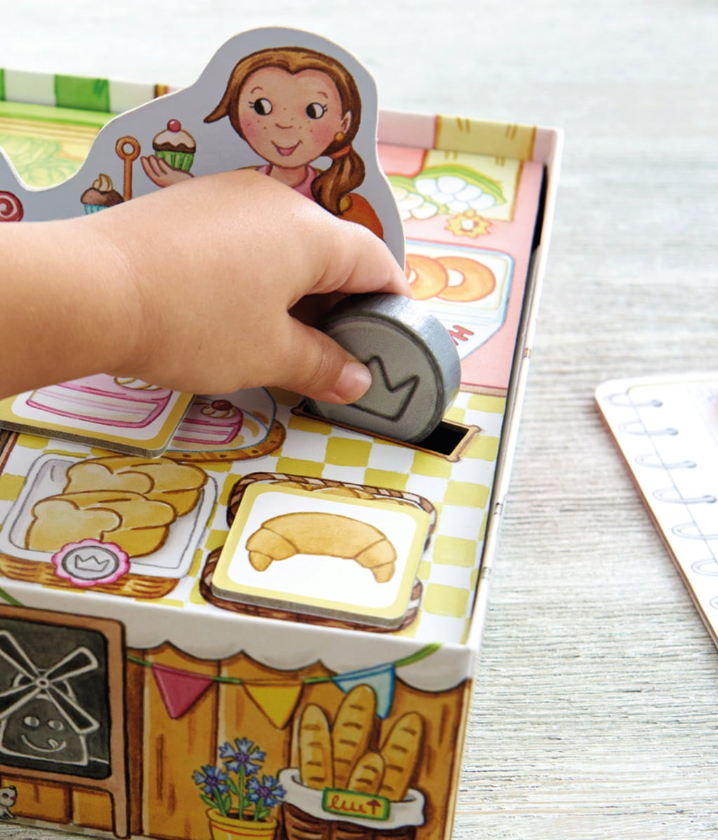 ¡Vamos al mercado! Las cosas que hay que comprar están anotadas en la lista de la compra, ¡pero no todos los puestos del mercado tienen lo que necesitas! Tira los dados de colores del puesto de la derecha para comprar queso, bocadillos, miel, etc.
