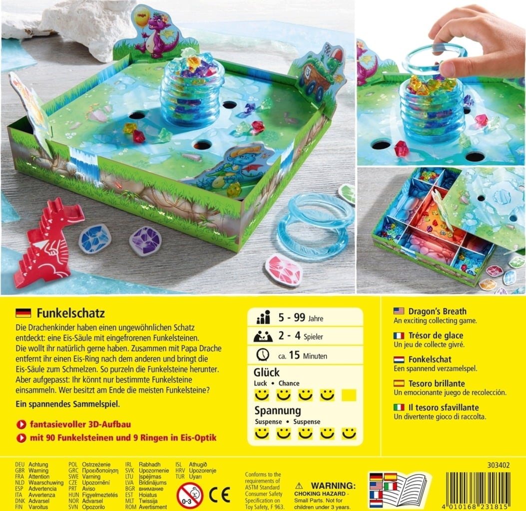 Contenido : 1 dragón papá, 1 base de caja con 4 separadores, 1 tablero de juego, 4 dragones pequeños, 9 anillos de hielo, 90 piedras brillantes (en 5 colores diferentes), 5 fichas de piedra brillante, 1 témpano de hielo, instrucciones.