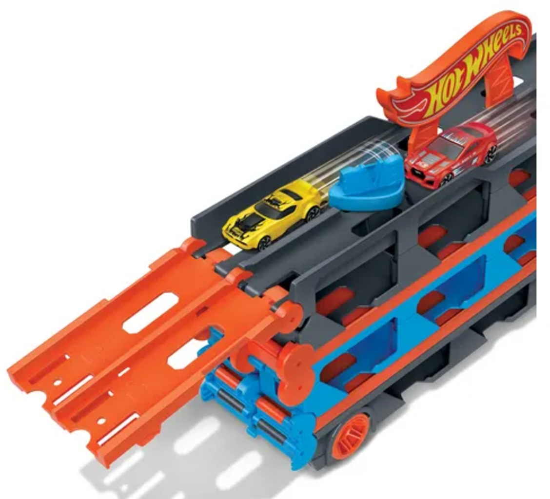 ¿Transportador o pista? ¡No tienes que elegir! Este camión a escala 1:64 cuenta con más de 20 asientos para asistencia. En un instante, el transportador se transforma en una pista de carreras de 180 cm de largo y dos carriles para disfrutar de carreras inolvidables.