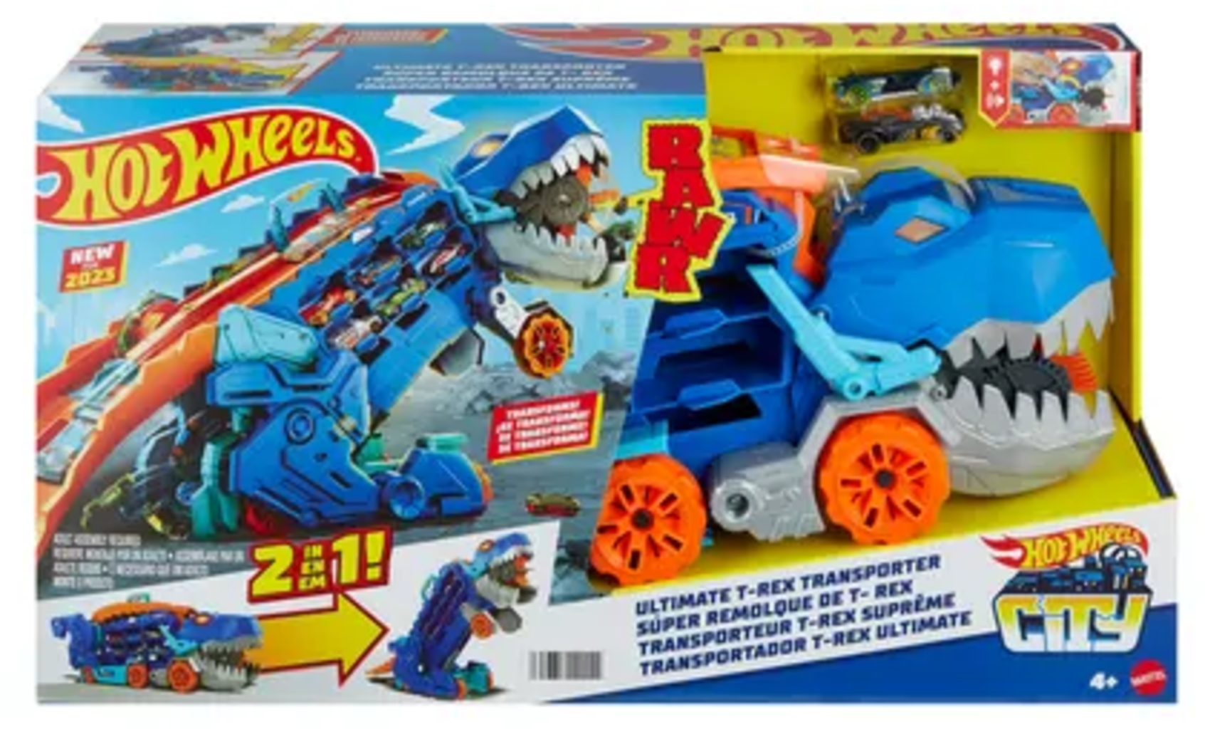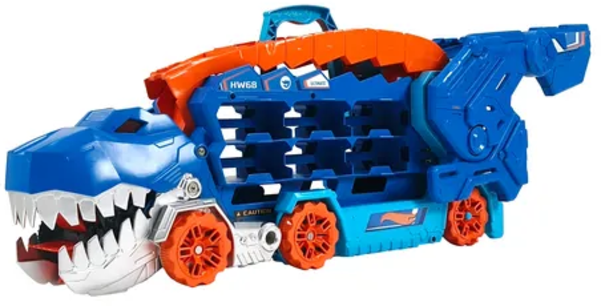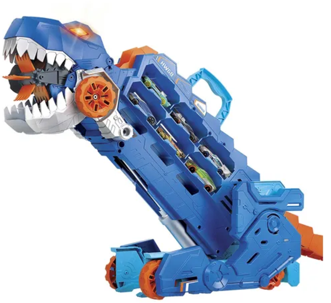 El Ultimate Transporter de Hot Wheels ofrece aparcamiento para más de 20 coches a escala 1:64. Cuando la acción lo requiere, el vehículo se transforma en un rugiente robot T-Rex en unos sencillos pasos. Pero eso no es todo También hay una pista de carreras en la parte trasera de la bestia.