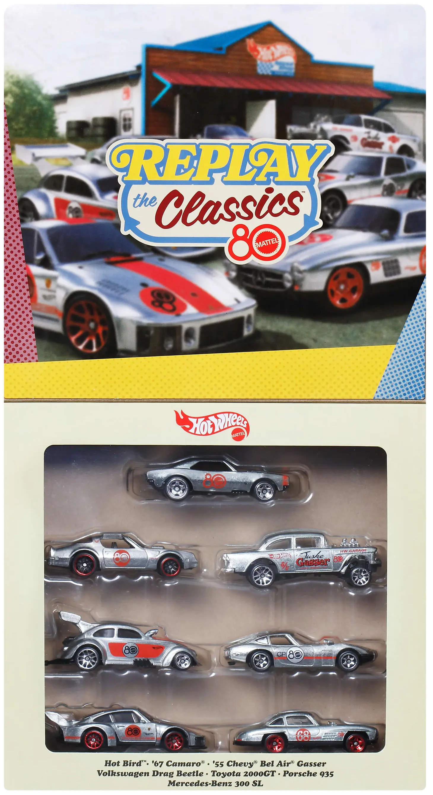 Para celebrar el 80 aniversario de Mattel, Hot Wheels presenta un pack especial de 7 vehículos de fundición a presión (1:64). Incluye modelos emblemáticos como el Chevy Bel-Air Gasser del 55, el Porsche 935, el Camaro del 67, el Toyota 2000GT, el VW Drag-Beetle, el Hot Bird y un Mercedes-Benz 300 SL. Incluso dos modelos están hechos completamente de zinc Todos los vehículos lucen la pintura ZAMAC con detalles en rojo. En el embalaje de aniversario de alta calidad, son perfectos para exponerlos o coleccionarlos.