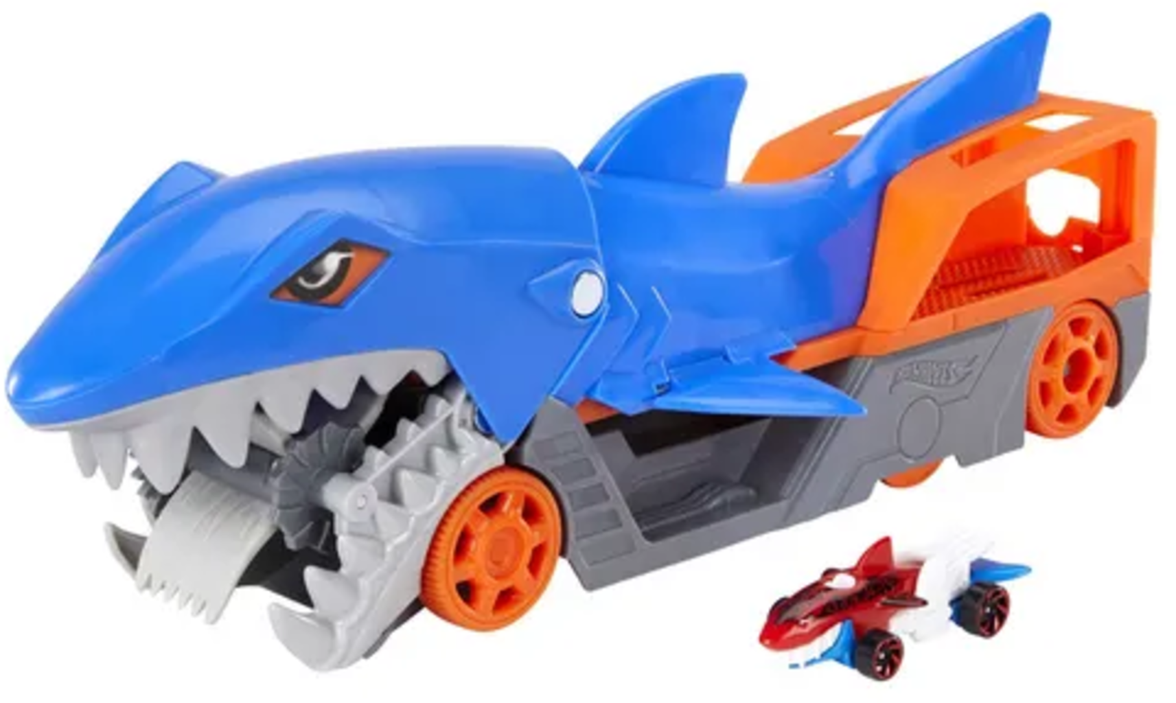 ¡Empuja el transportador para mover la boca del tiburón! Si un coche se interpone en su camino, se lo traga sin más y lo almacena en su estómago. Los vehículos pueden bajarse del transportador mediante una rampa trasera.