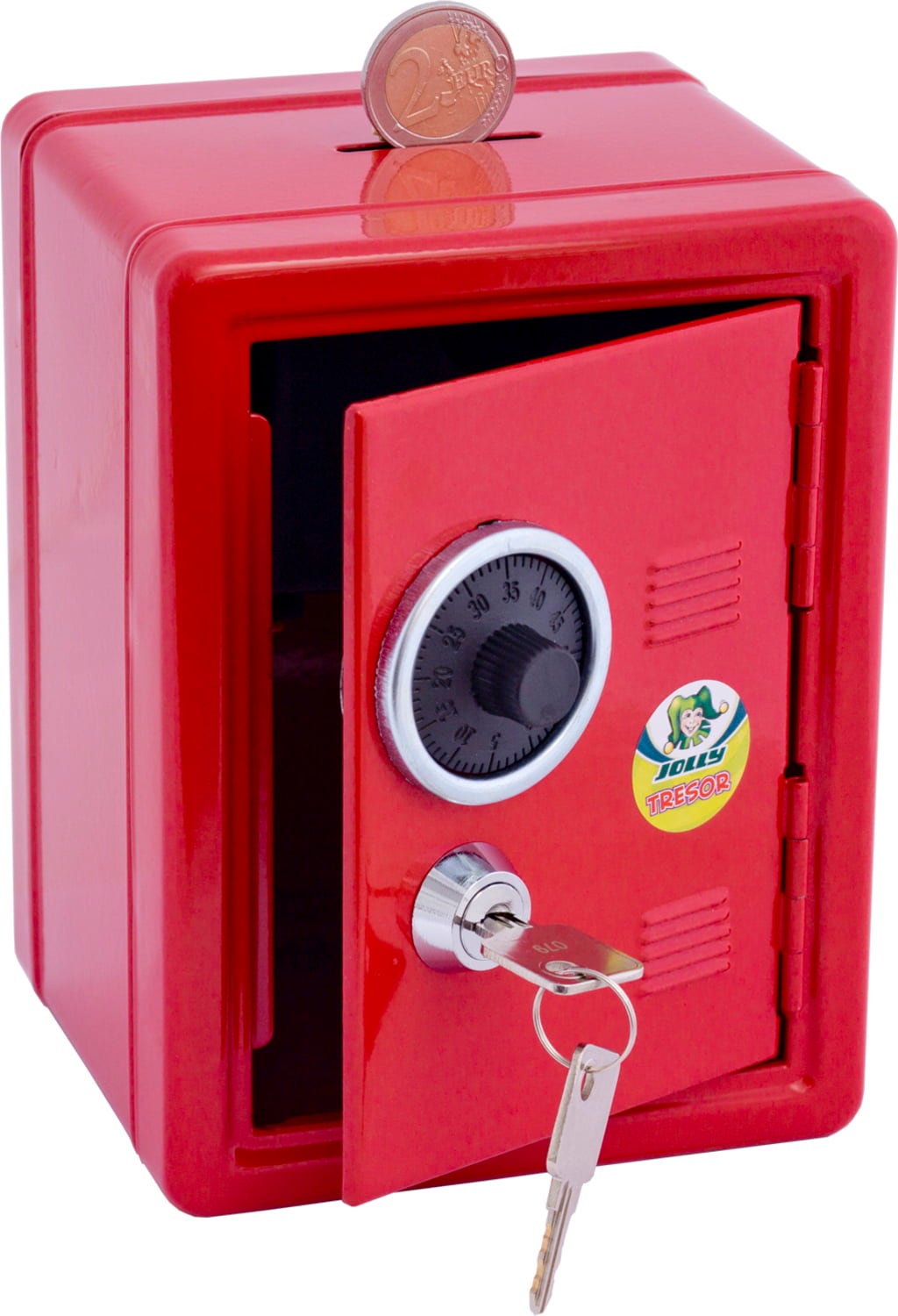 Preciosa caja fuerte en forma de caja fuerte de metal pintado con llave y cerradura de combinación para guardar con seguridad los pequeños ahorros.