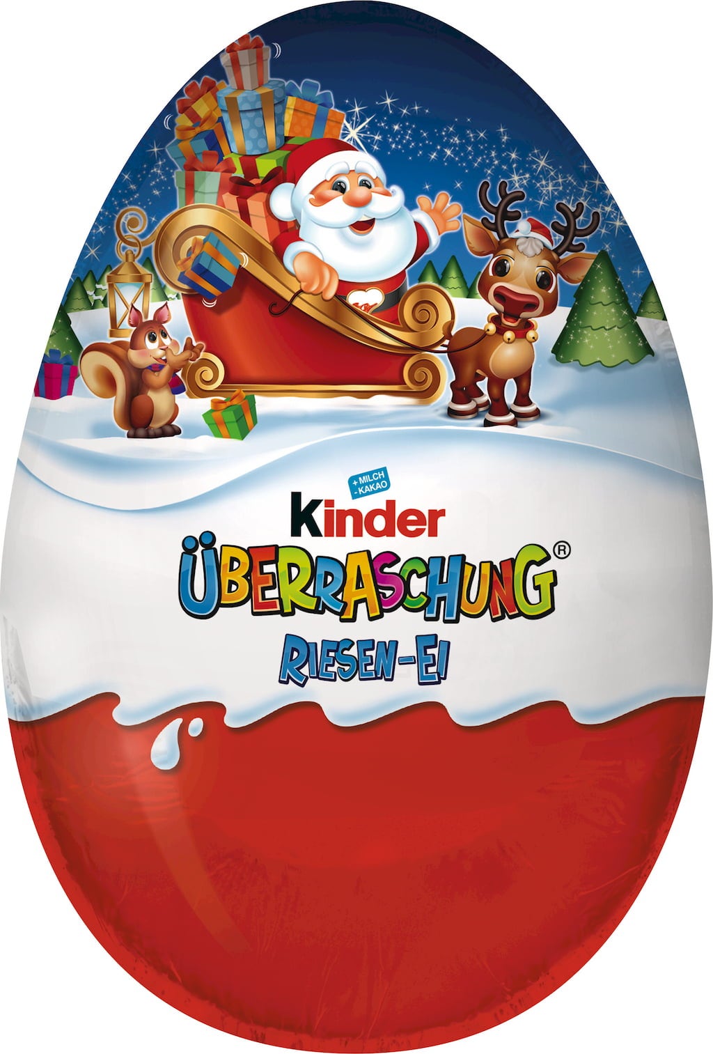 Un clásico en el universo de los dulces: el aromático chocolate con leche con glaseado de chocolate blanco que incluye una sorpresa en su interior. El huevo gigante es más grande que la versión convencional y tiene una fantástica decoración navideña.
