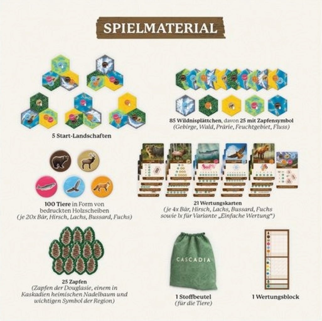 En Cascadia recorres los parajes salvajes del noroeste del Pacífico. Combina fichas de paisaje para conseguir el mayor número de puntos al final. Además de la táctica adecuada, también necesitas un poco de suerte. La variante para principiantes gustará a toda la familia. Los jugadores experimentados empezarán a pensar en la versión especial, más complicada. Si lo prefiere, también es posible jugar solo.
