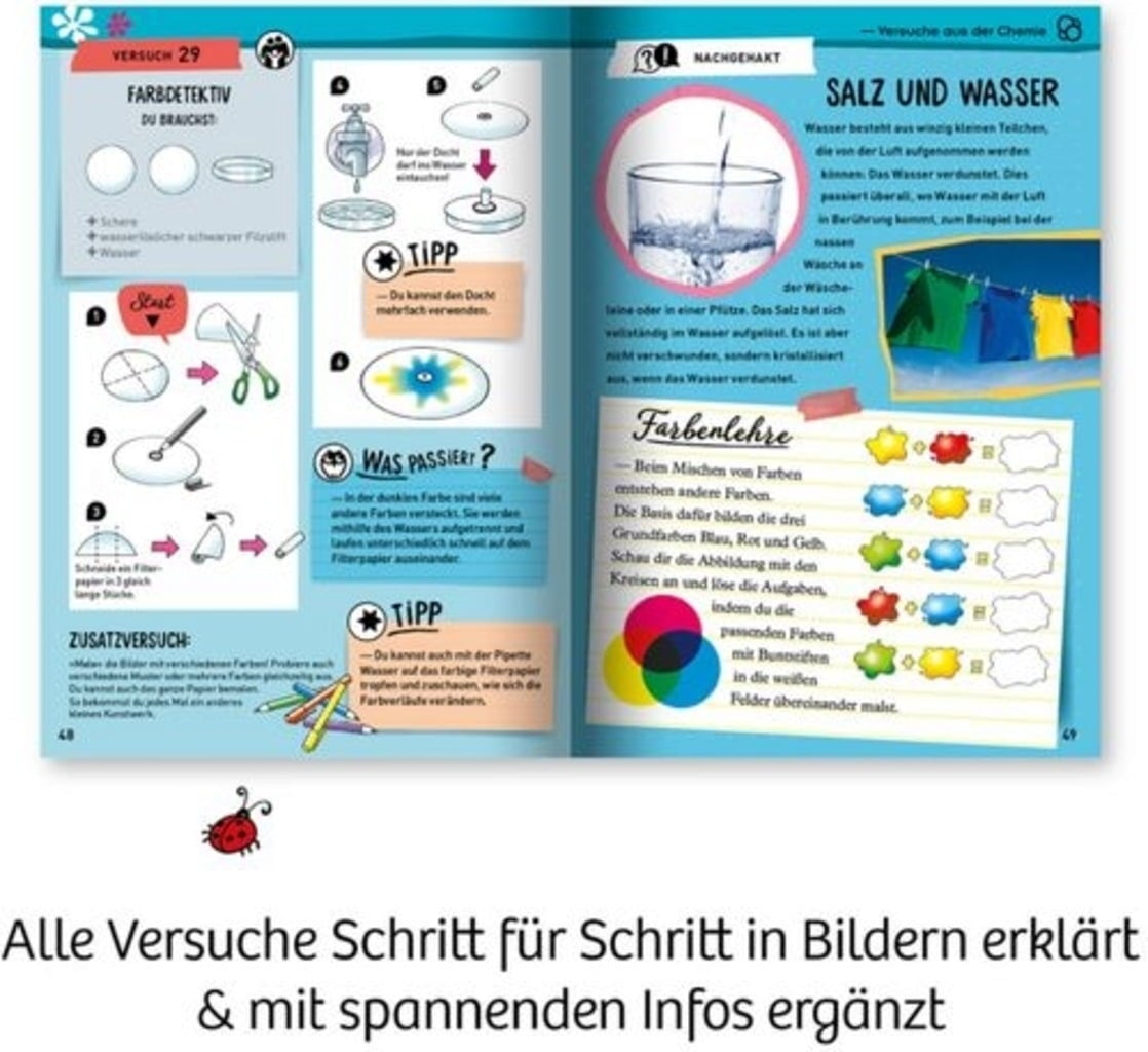 Experimentos apasionantes para jóvenes investigadores a partir de 5 años. En 29 experimentos de biología, química y física se analizan diversos fenómenos cotidianos. En esta experiencia lúdica de aprendizaje se utilizan todos los sentidos. Hay trabajo manual, observaciones y descubrimientos. Por supuesto, nunca falta la diversión. Las instrucciones, adaptadas a la edad y con numerosas imágenes, guían al usuario a través de los experimentos de forma sencilla y comprensible, incluso si aún no tienes buenas habilidades de lectura.