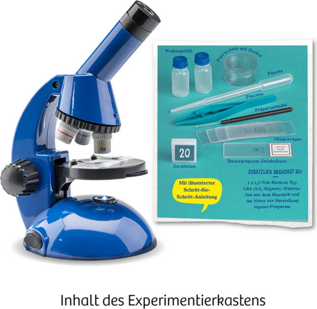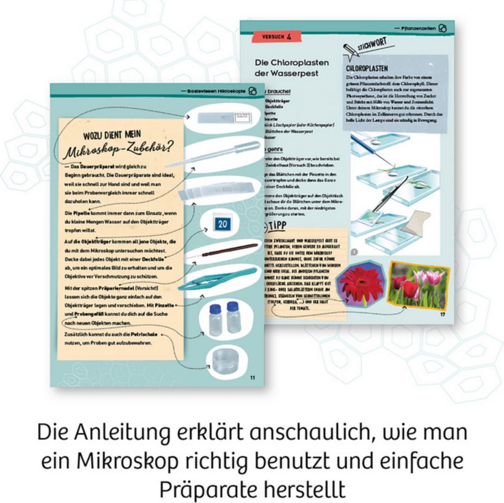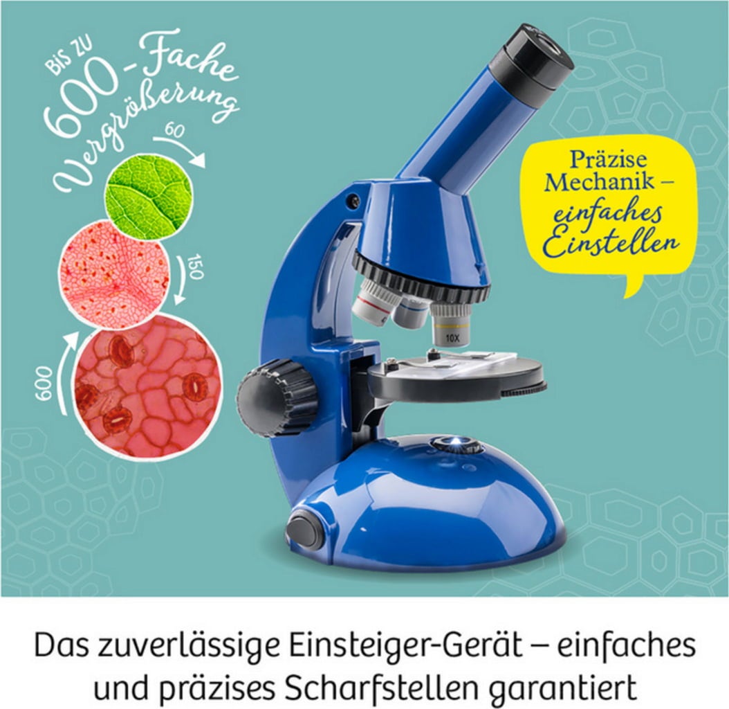 Con este microscopio, las partículas diminutas se magnifican hasta 600 veces. Gracias a su fabricación de alta calidad, el microscopio es especialmente robusto y fácil de manejar, incluso para principiantes. Además, este kit científico incluye una amplia gama de accesorios, lo que permite a los pequeños exploradores, a partir de los 8 años, sentirse como auténticos científicos y crear muestras a partir de objetos cotidianos.