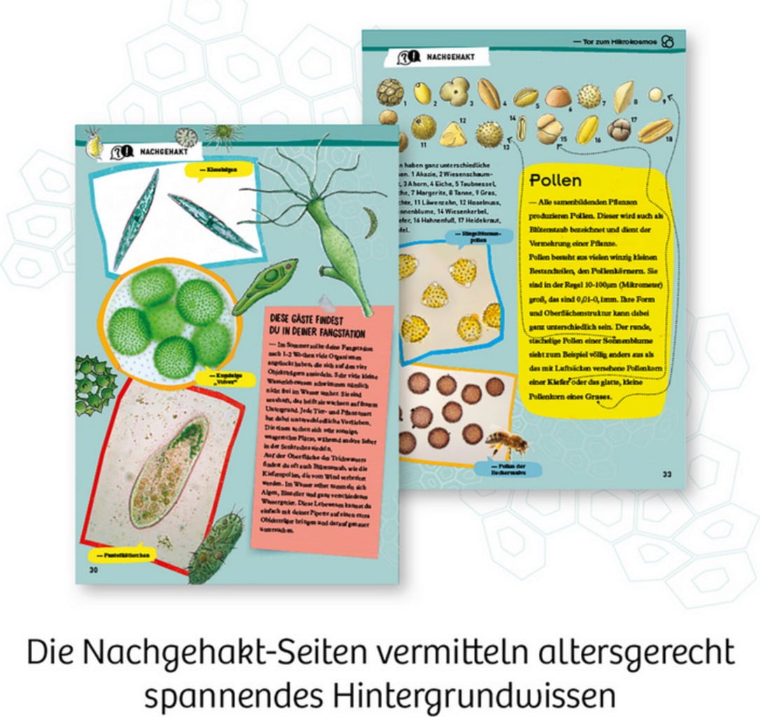 El folleto adjunto, pensado para niños, también ofrece consejos y trucos importantes para manejar el microscopio y proporciona una visión fascinante del mundo de la microscopía.