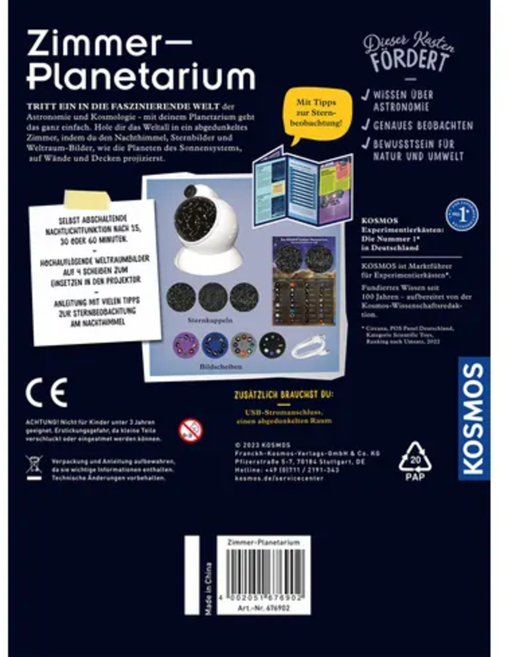 ¡Transforma tu techo en un impresionante cielo estrellado! El planetario puede proyectar dos imágenes simultáneamente. Esto significa que siempre puedes crear nuevas combinaciones de cúpulas estelares y emocionantes imágenes espaciales. Las instrucciones (en alemán) ofrecen información interesante sobre diversos objetos celestes y consejos para observar las estrellas en la naturaleza.