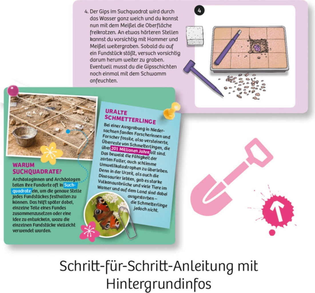 Con este emocionante set, asumirás el papel de un arqueólogo y gestionarás tu propia excavación. Busca cuentas mágicas de purpurina, que extraerás cuidadosamente del bloque de yeso con la herramienta incluida. Hermosas flores y hojas te esperan.